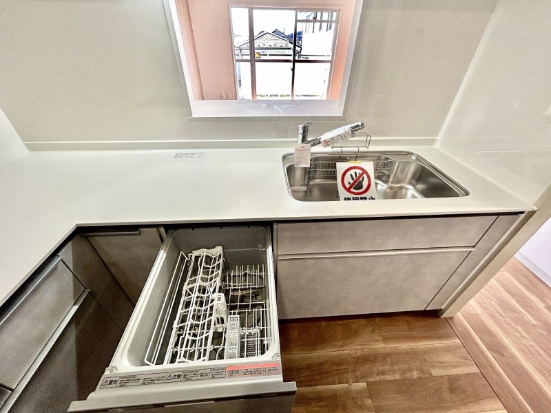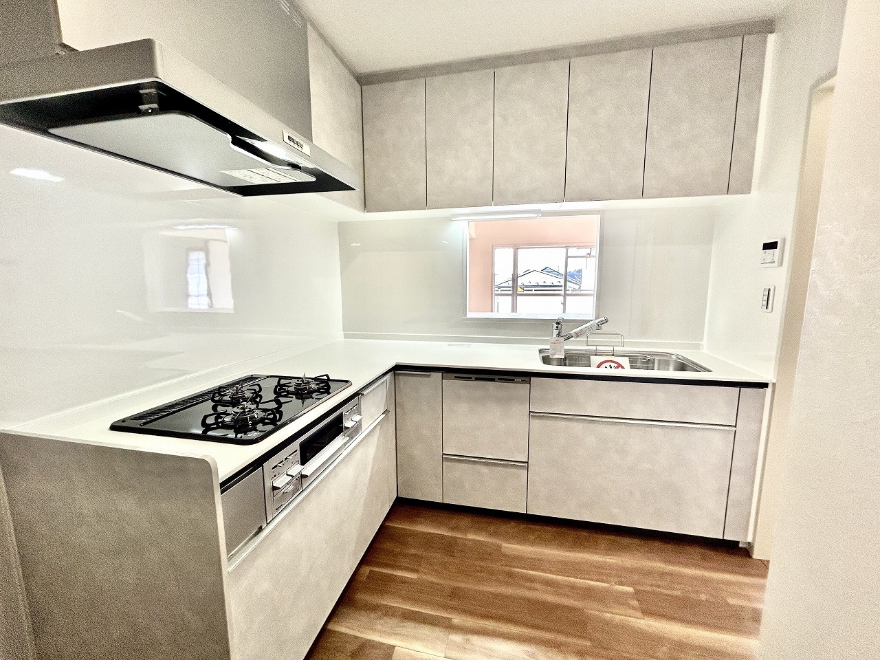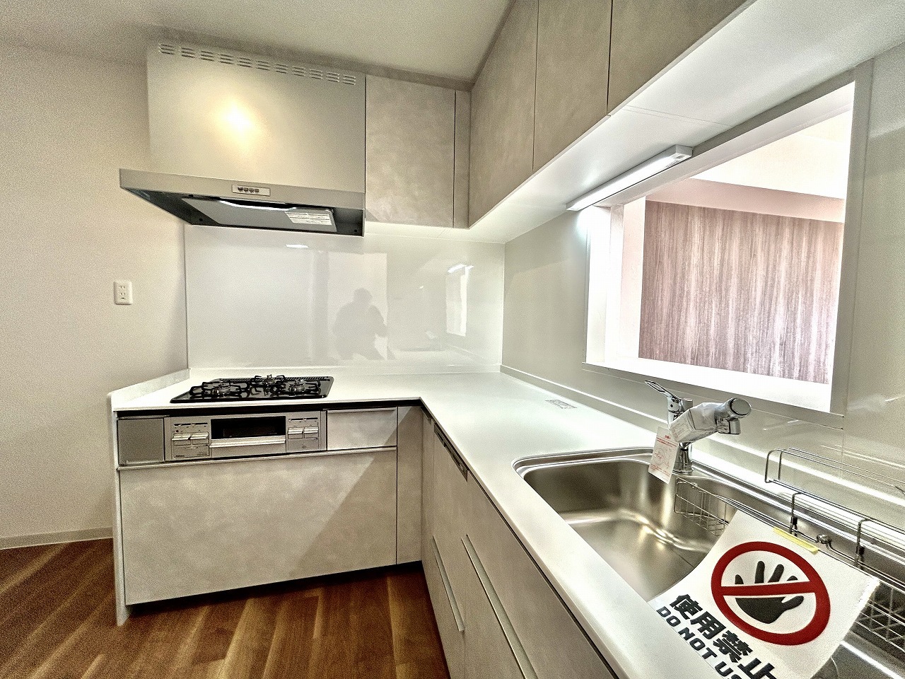 L字キッチンで使い勝手も良好です。上部に収納もある為、食器などの収納にも便利です。
