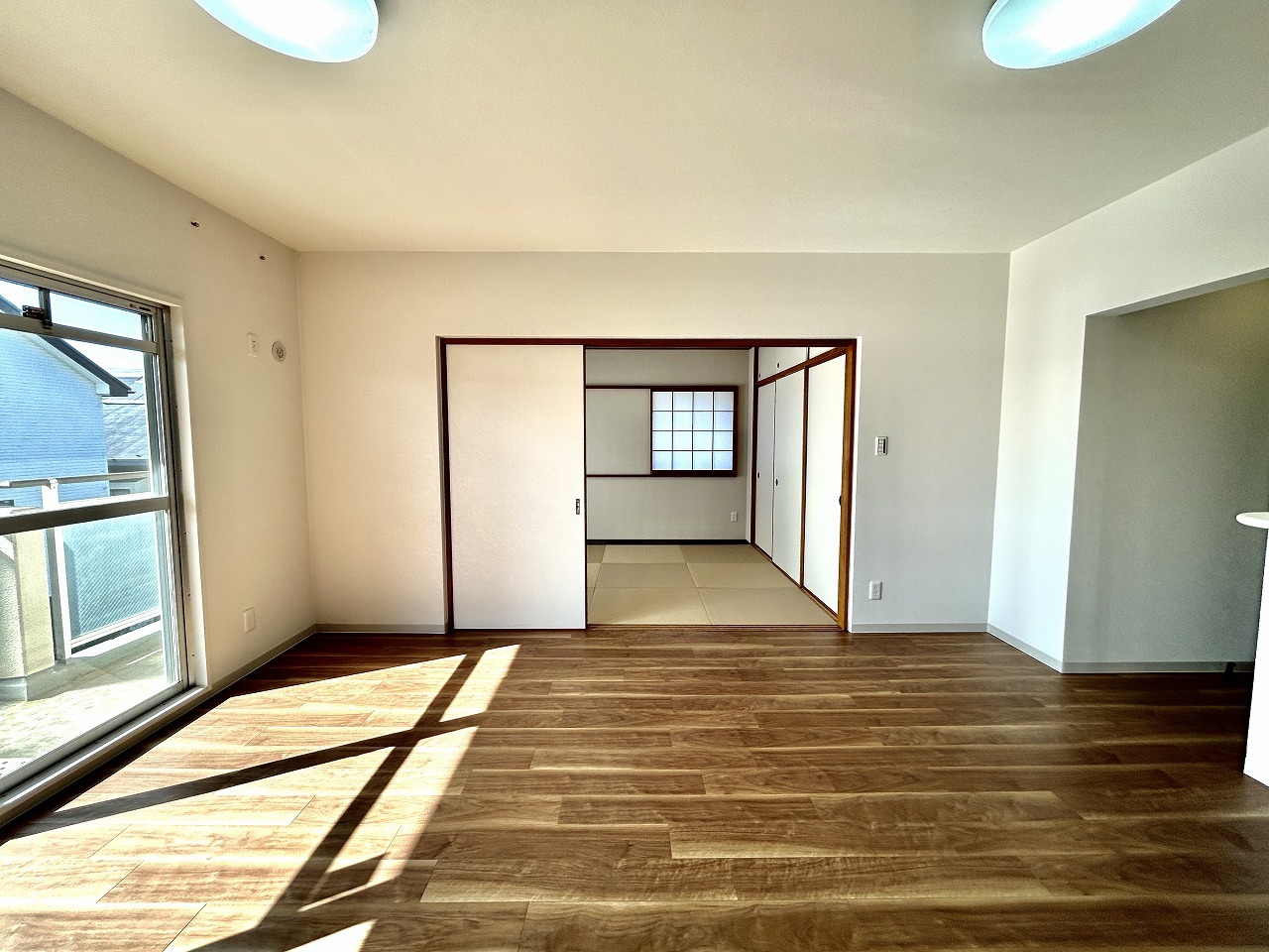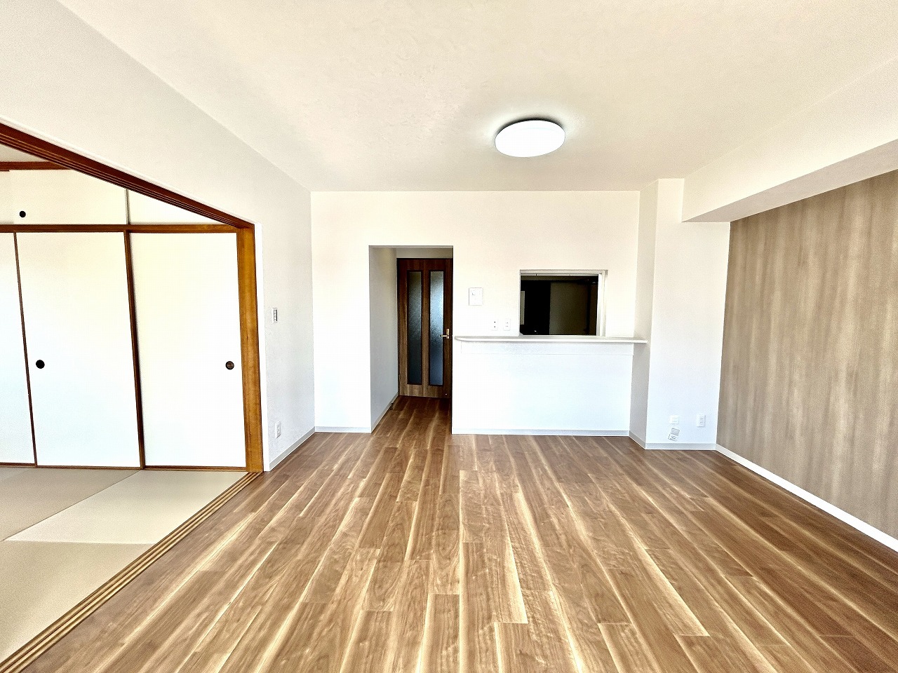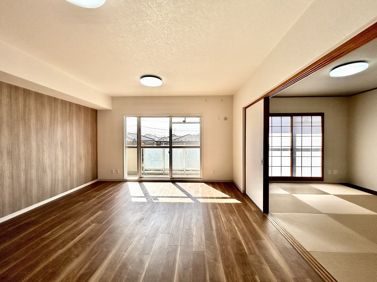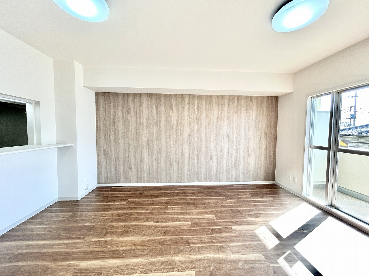 大きな開口部から明るい光が差し込む、日中の室内の明るさがこの部屋の魅力です。