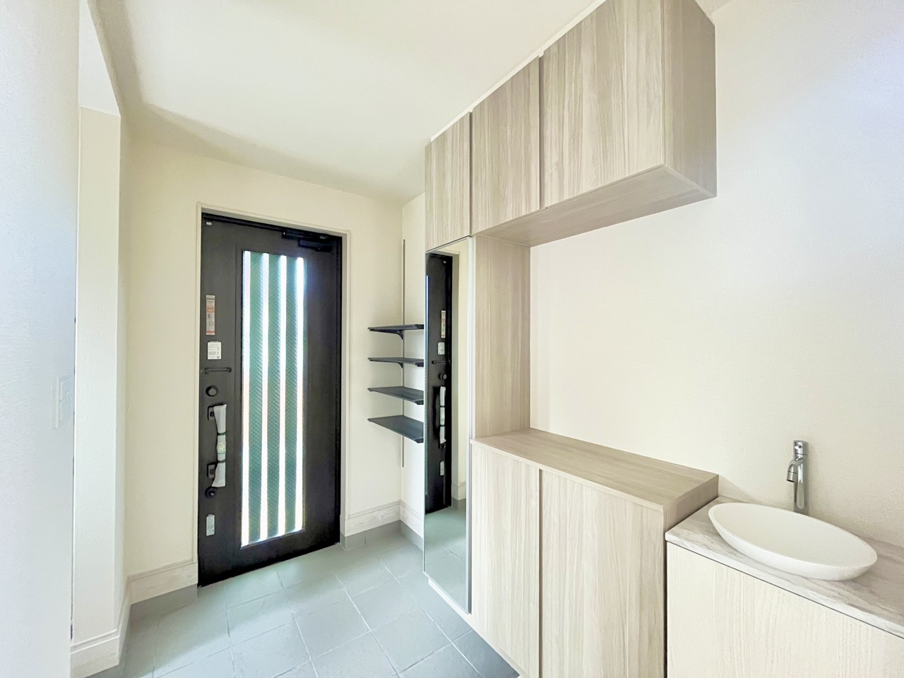明るく開放的な玄関、靴の脱ぎ履きもしやすく、収納も豊富でご家族皆様の靴をスッキリ収納できます。