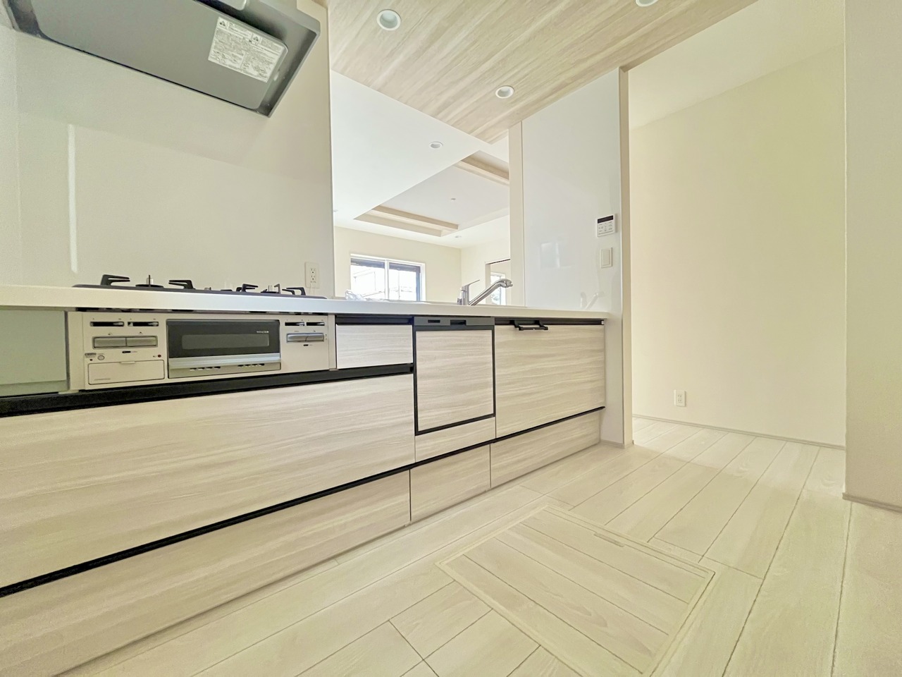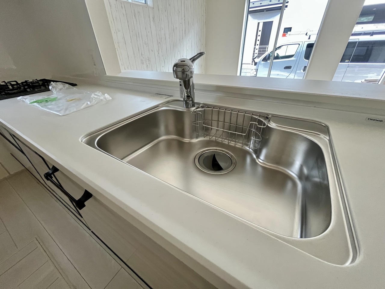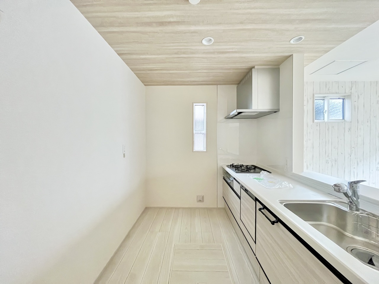 収納量豊富なシステムキッチン。明るい光が差し込む窓も調味料置き場などに役立ちます。カウンターキッチンと違い、背面を広く使えるので自由度が高いのも嬉しいですね。