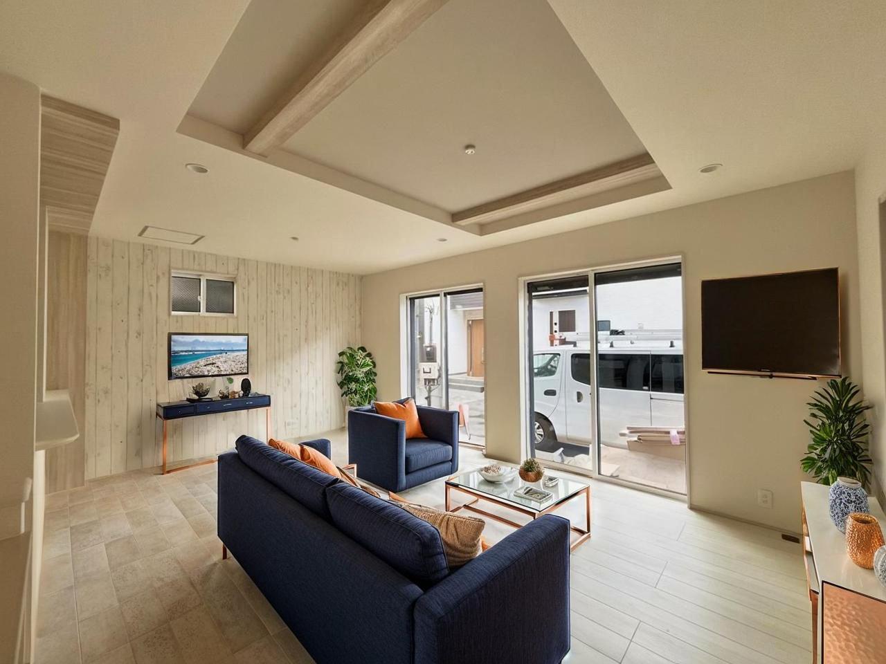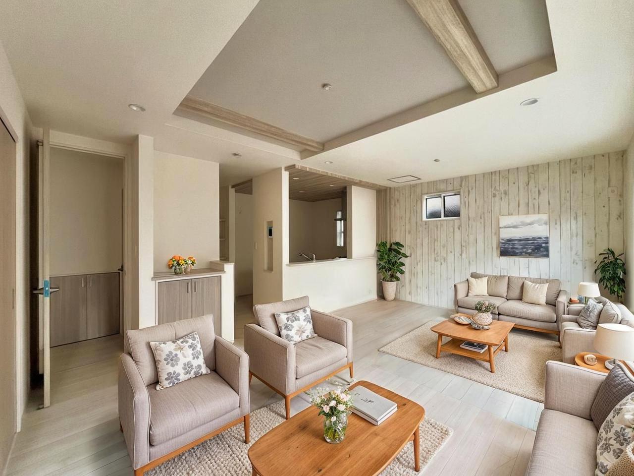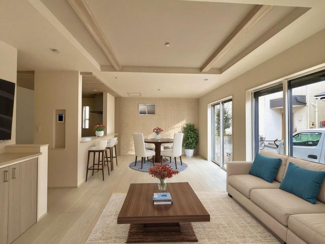 家族や友人、両親、親戚とこれから沢山の時間を紡ぐのだろう。そこを彩るのは窓から見える青い空、心地よい緑。そんなイメージが膨らむリビングスペース。