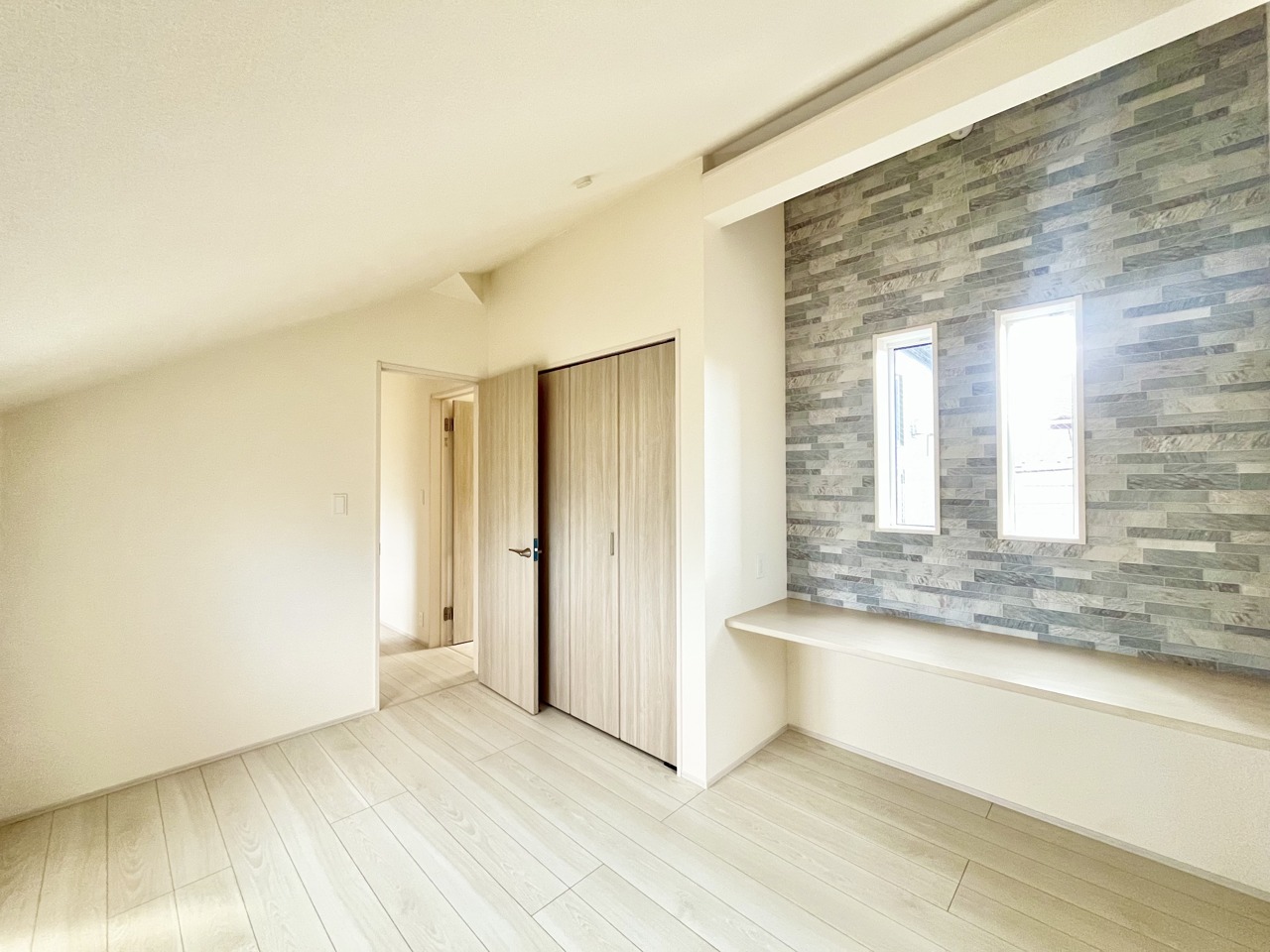 アクセントクロスを使用したオシャレな洋室。窓からそそぐ陽の光が眩しいベッドルームは、朝の目覚めが心地良く迎えられそうです。