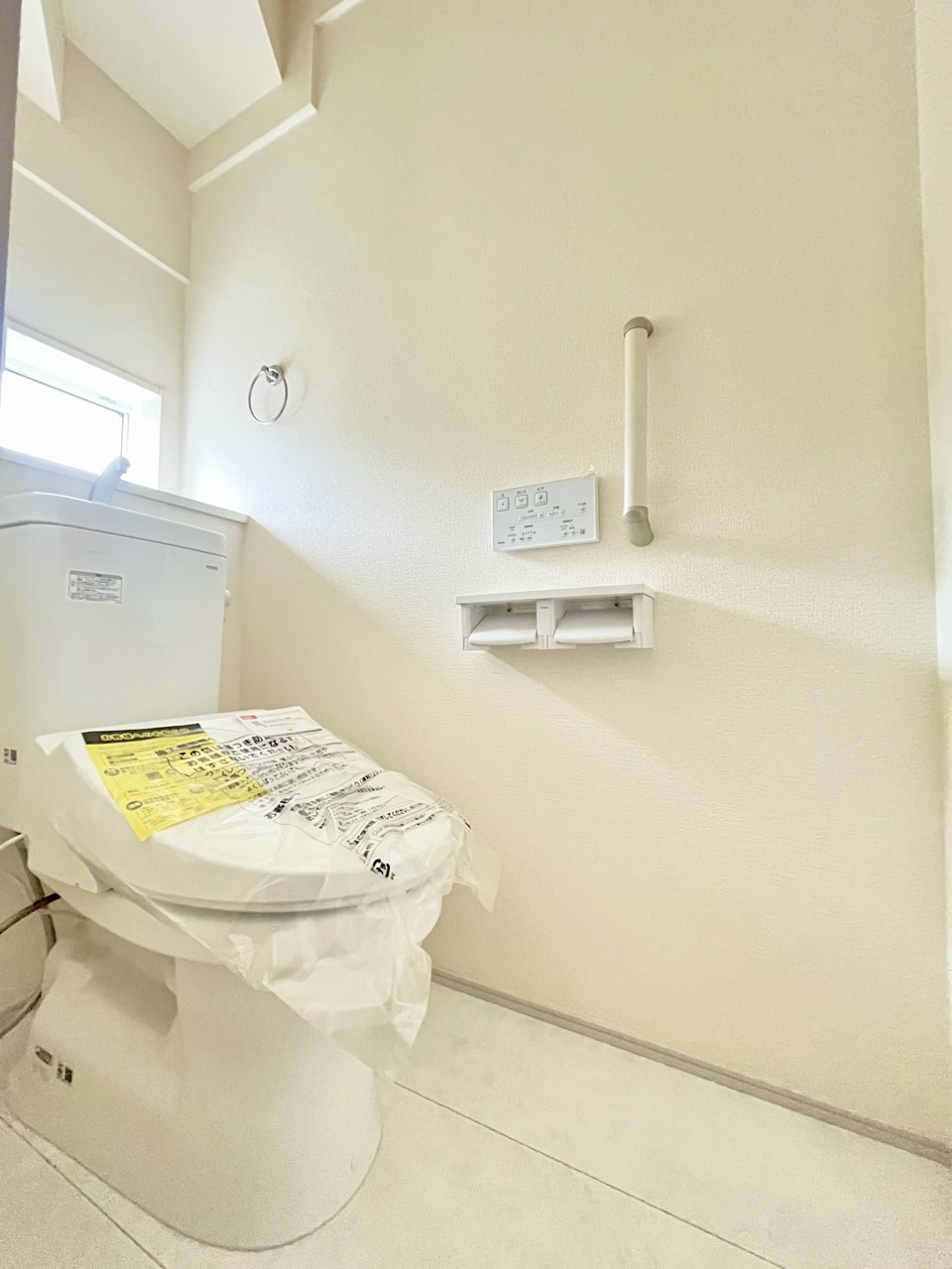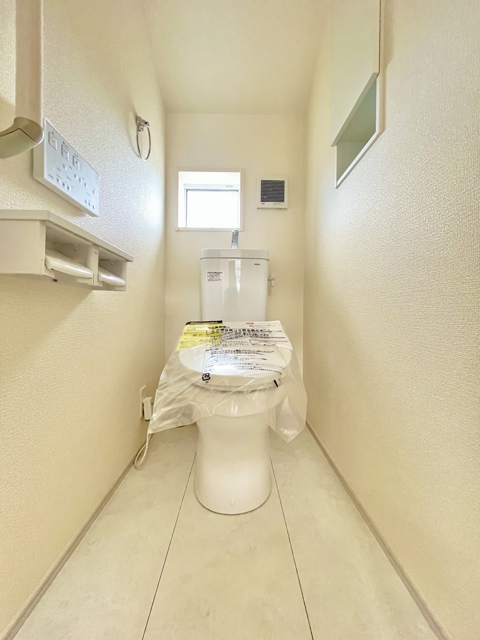 ウォシュレット機能付きのトイレ。換気のしやすい窓付きで、収納もあり実用性も兼ね備えた造り。
