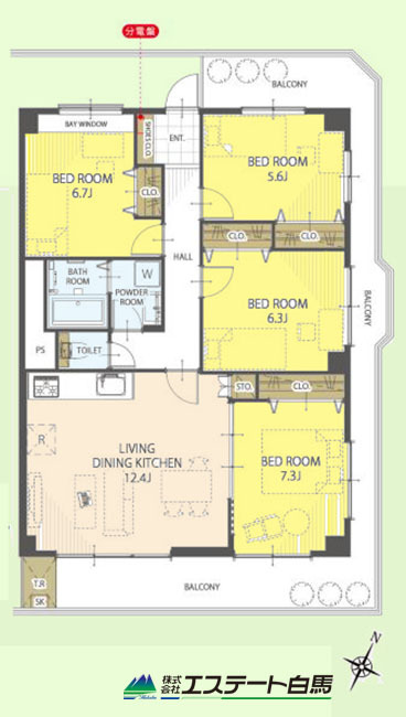 | 間取 | 4LDK (洋室7.3帖、洋室6.7帖、洋室6.3帖、洋室5.6帖、LDK12.4帖) | ||
