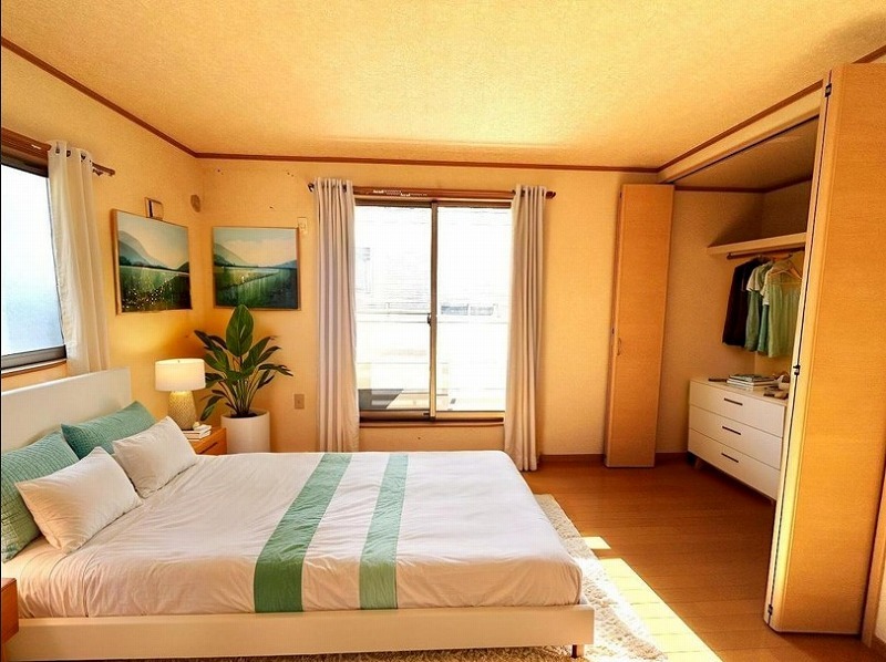 ゆとりの8帖ある寝室、陽光が入りやすく朝の目覚めも気持ち良く起こしてくれます。