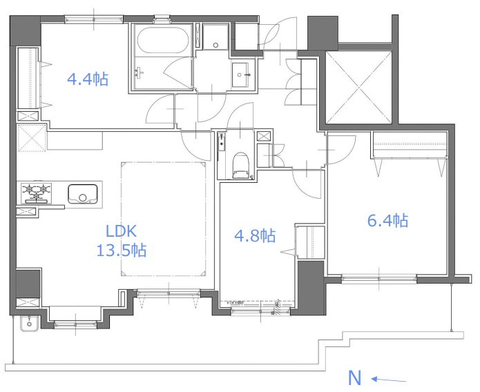 | 間取 | 3LDK (LDK13.5帖、洋室6.4帖、洋室4.8帖、洋室4.4帖) | ||