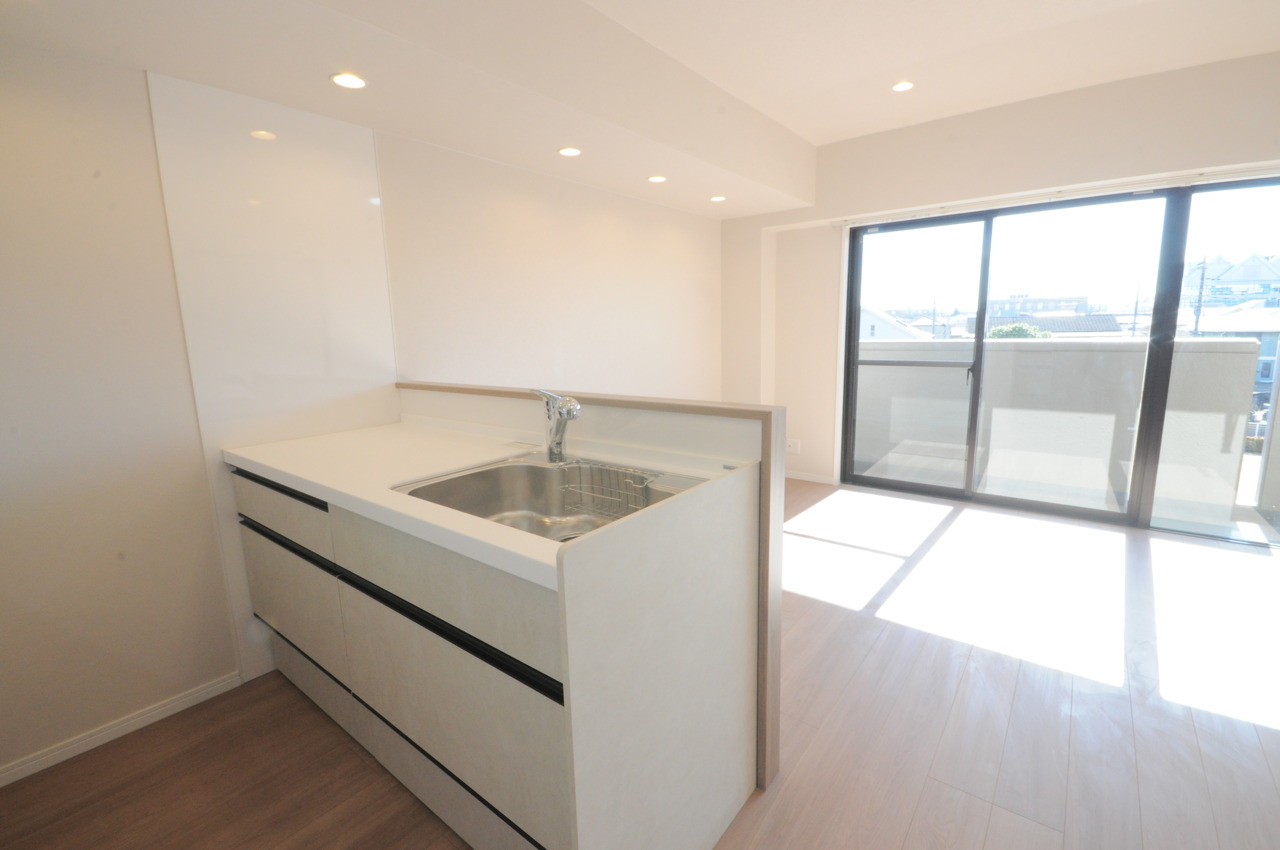リビングにいる家族の顔が見渡せるカウンターキッチン。お料理もより一層おいしく、楽しく。食器棚を背面に設置しても十分な広さを確保しています。