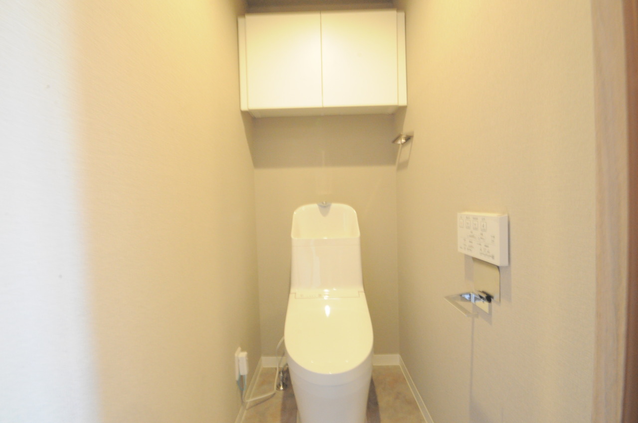 ウォシュレット機能付きのトイレ。収納もあり実用性も兼ね備えた造り。
