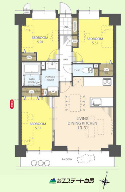 | 間取 | 3LDK (洋室5.5帖、洋室5帖、LDK13.3帖、洋室5.5帖) | ||
