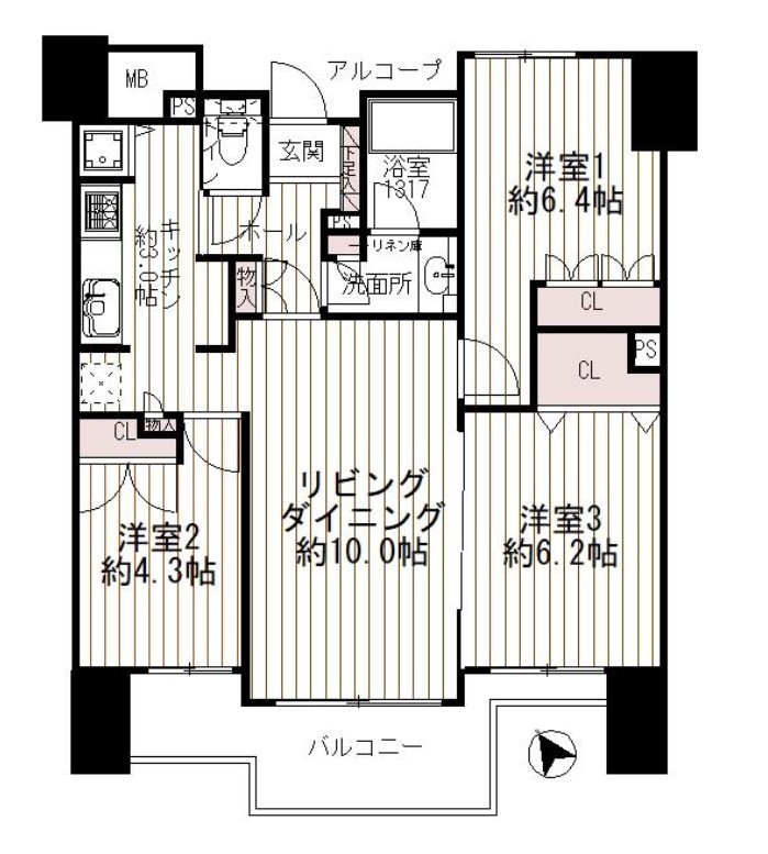 | 間取 | 3LDK (LD10帖、K3帖、洋室6.4帖、洋室6.2帖、洋室4.3帖) | ||