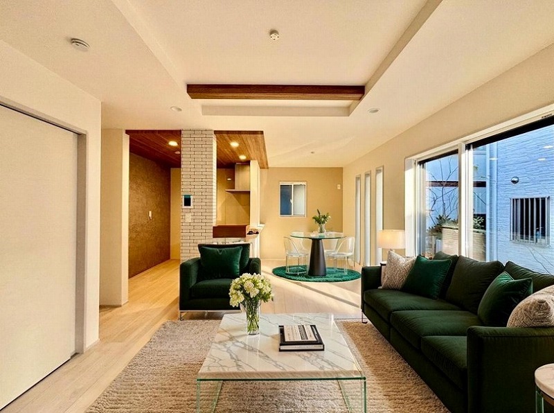 家族や友人、両親、親戚とこれから沢山の時間を紡ぐのだろう。そこを彩るのは窓から見える青い空、心地よい緑。そんなイメージが膨らむリビングスペース。