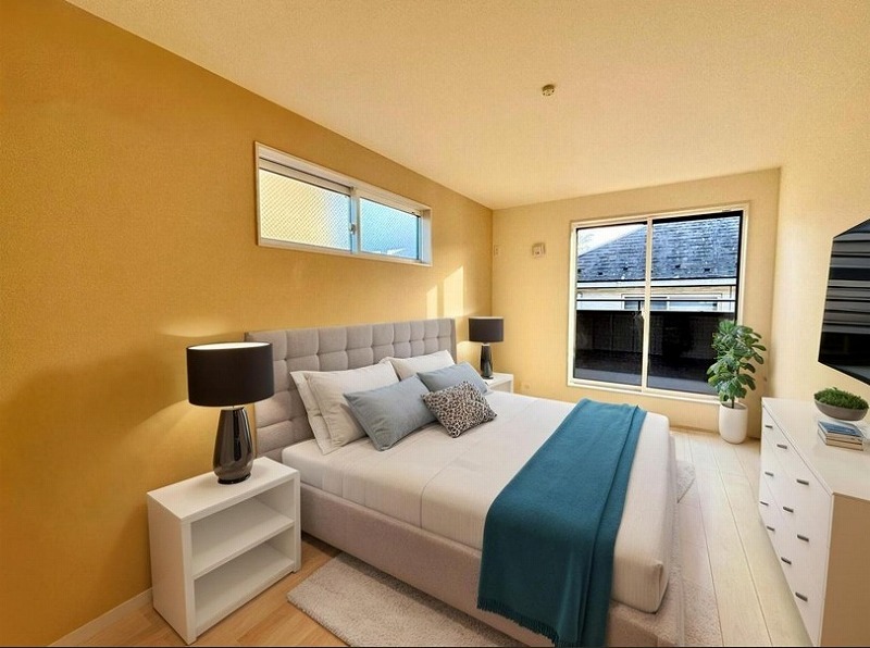 アクセントクロスを使用したオシャレな洋室。窓からそそぐ陽の光が眩しいベッドルームは、朝の目覚めが心地良く迎えられそうです。