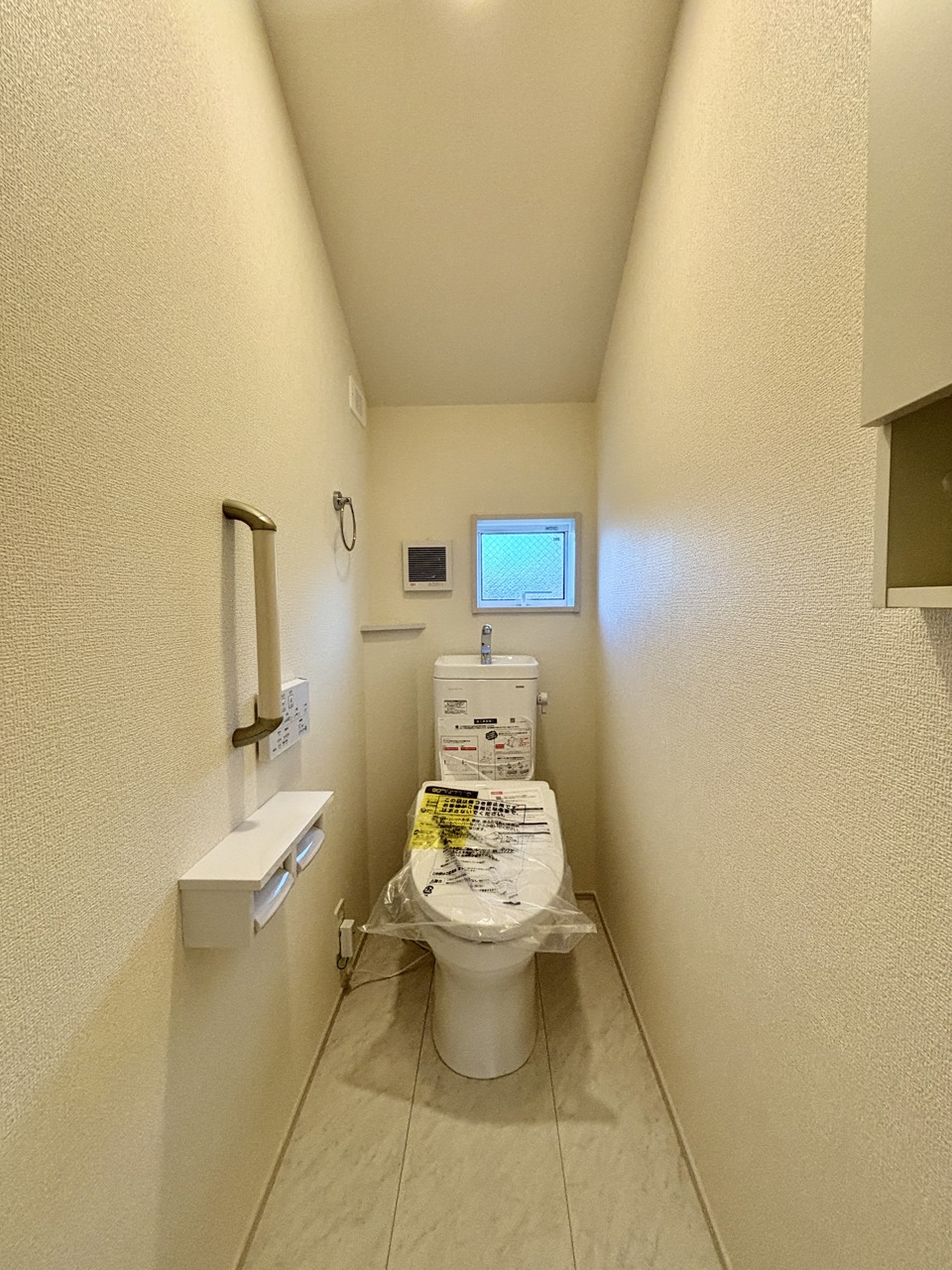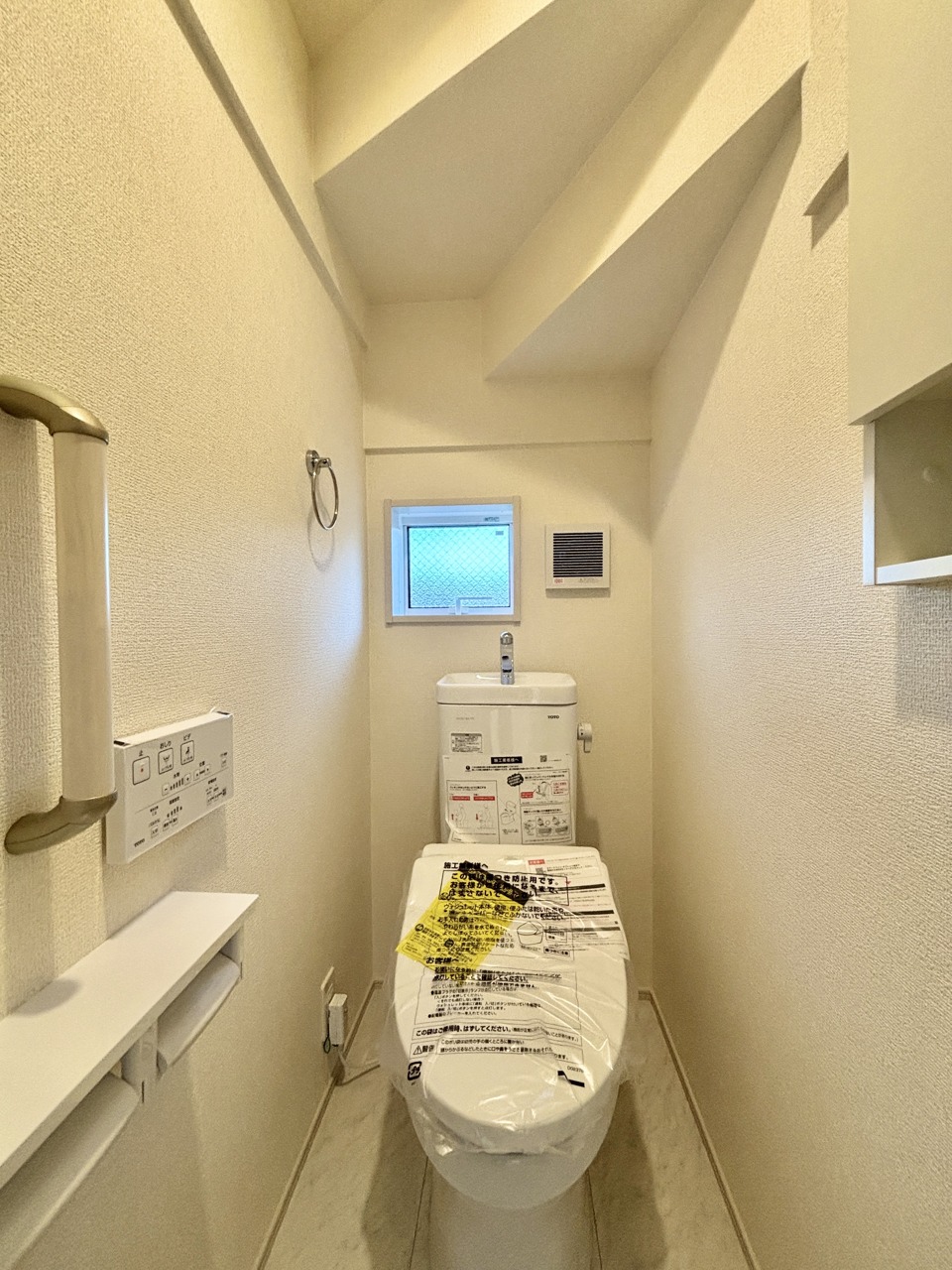 ウォシュレット機能付きのトイレ。換気のしやすい窓付きで、収納もあり実用性も兼ね備えた造り。