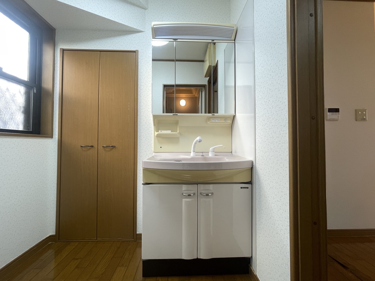 洗面化粧台は清潔感の漂うホワイトをベースカラーに、シンプルなデザインで。