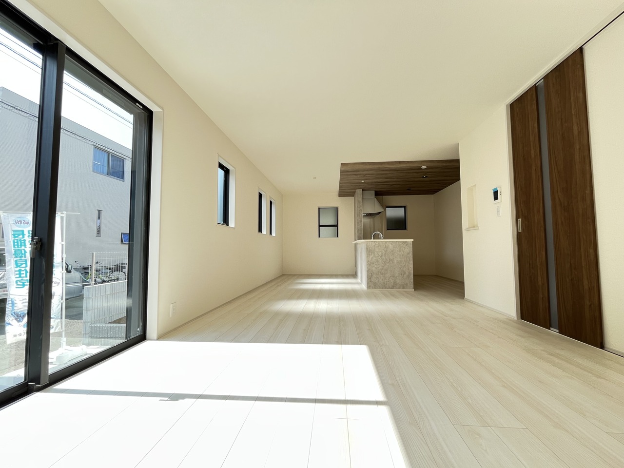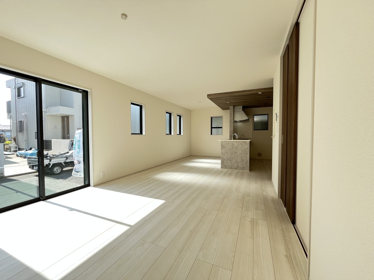 家族や友人、両親、親戚とこれから沢山の時間を紡ぐのだろう。そこを彩るのは窓から見える青い空、心地よい緑。そんなイメージが膨らむリビングスペース。