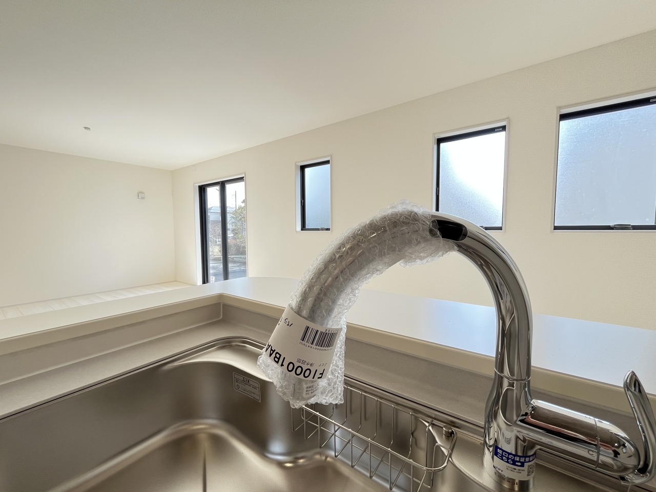 人工大理石を使用したシステムキッチン。永く傷つきにくく、お手入れもしやすい高機能性です。