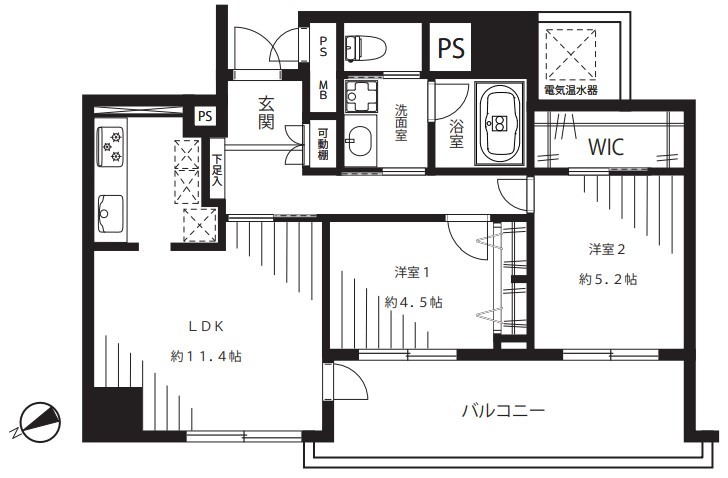 | 間取 | 2LDK (LDK11.4帖、洋室5.2帖、洋室4.5帖) | ||