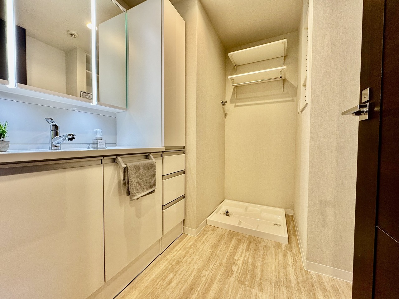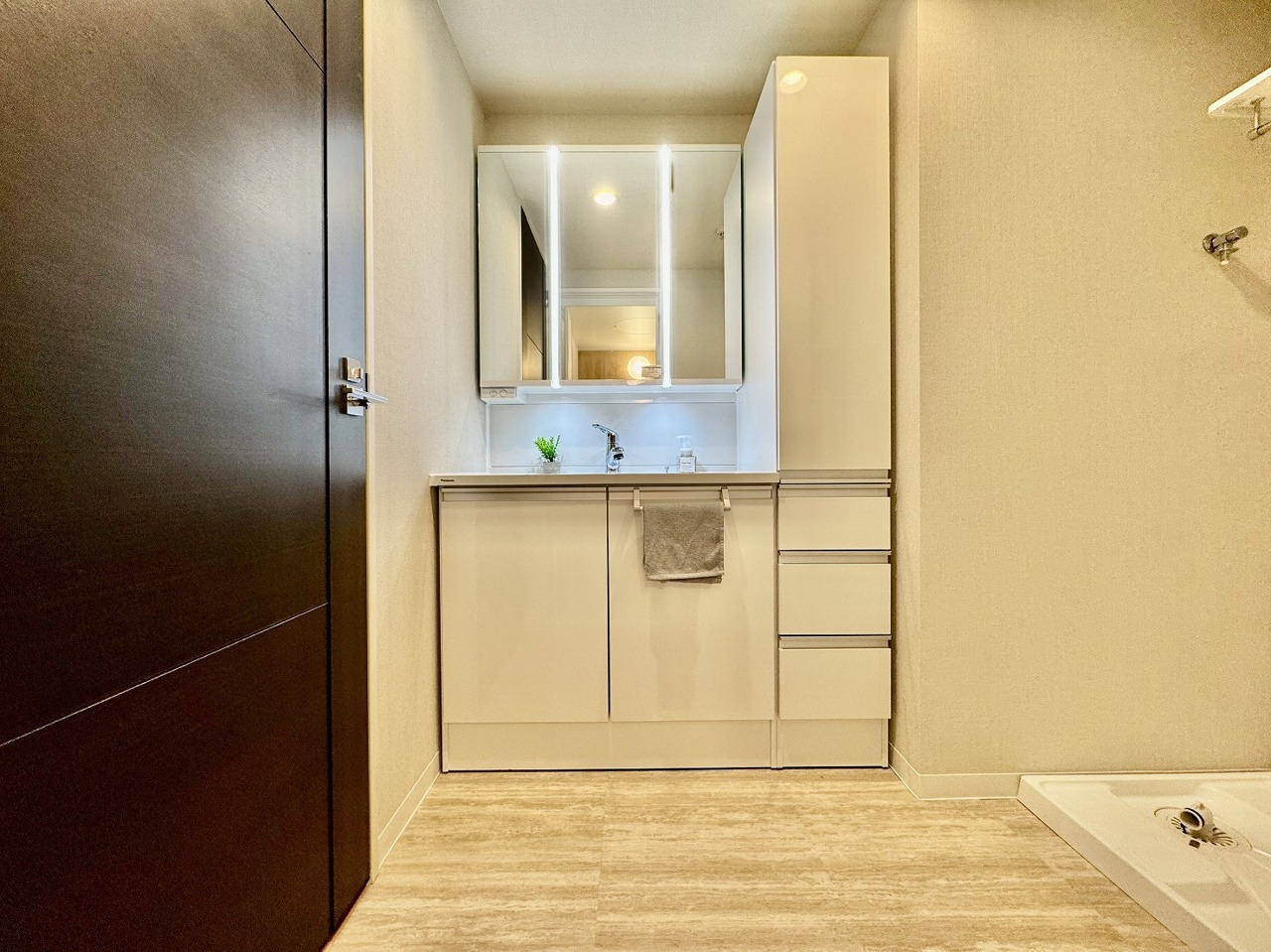 三面鏡にハンドシャワー付き、 使いやすい洗面台。