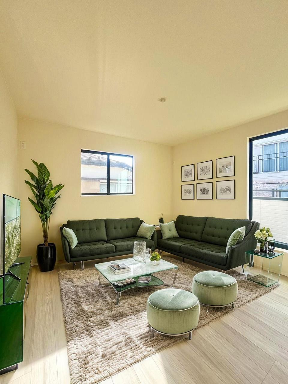 家族や友人、両親、親戚とこれから沢山の時間を紡ぐのだろう。そこを彩るのは窓から見える青い空、心地よい緑。そんなイメージが膨らむリビングスペース。