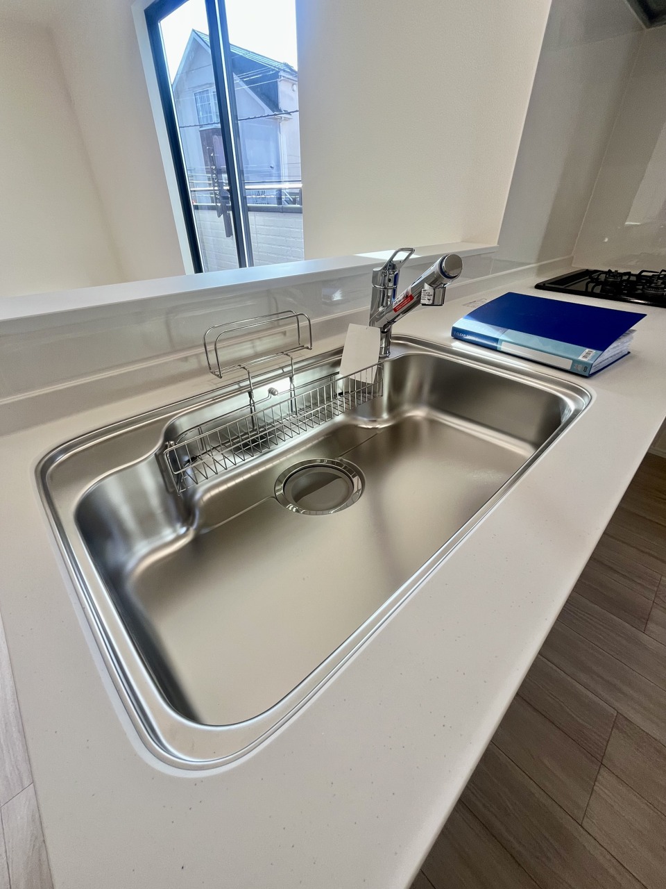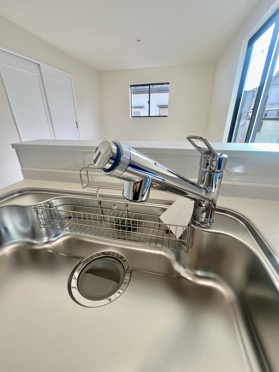 収納量豊富なシステムキッチン。明るい光が差し込む窓も調味料置き場などに役立ちます。カウンターキッチンと違い、背面を広く使えるので自由度が高いのも嬉しいですね。