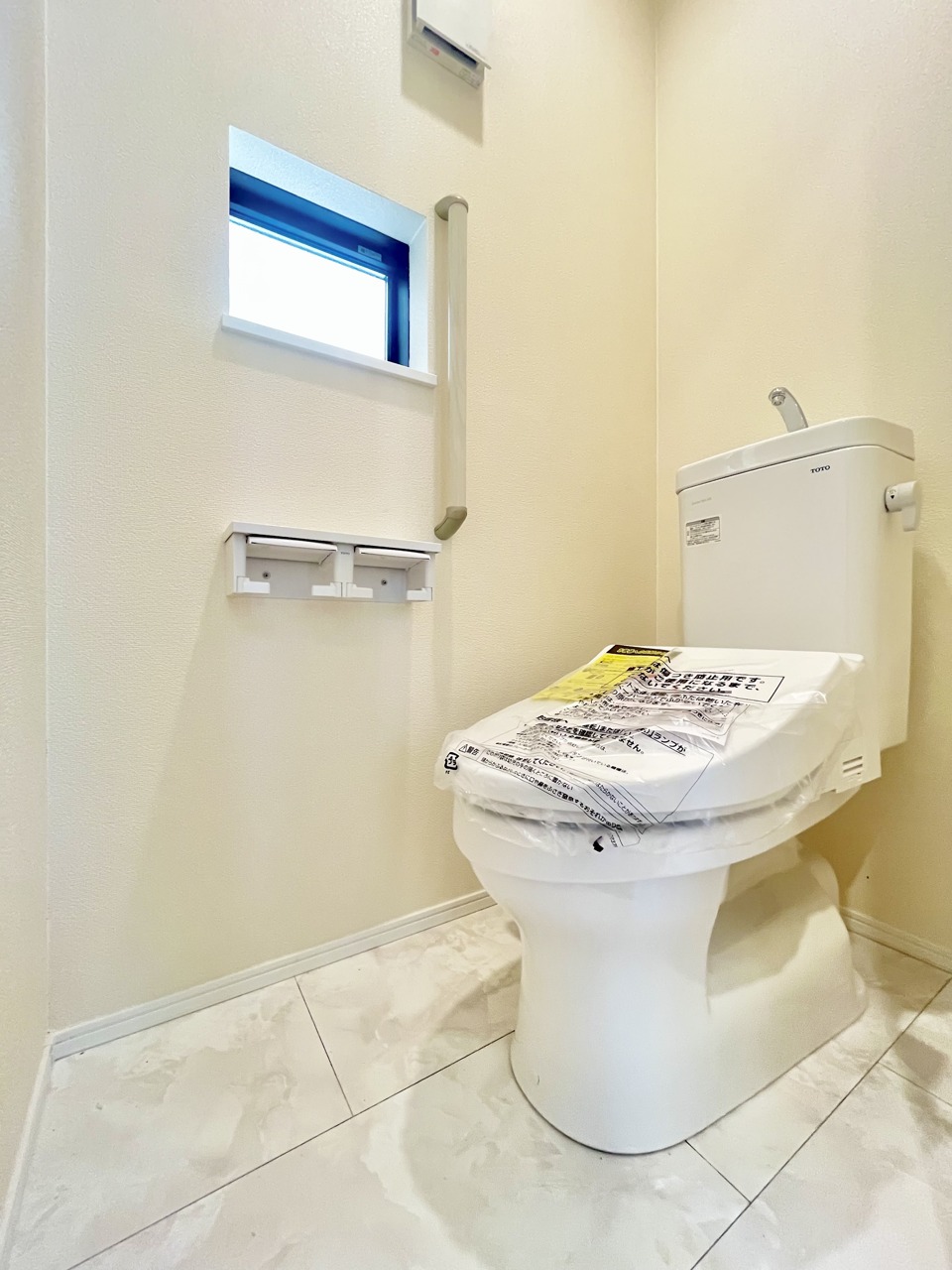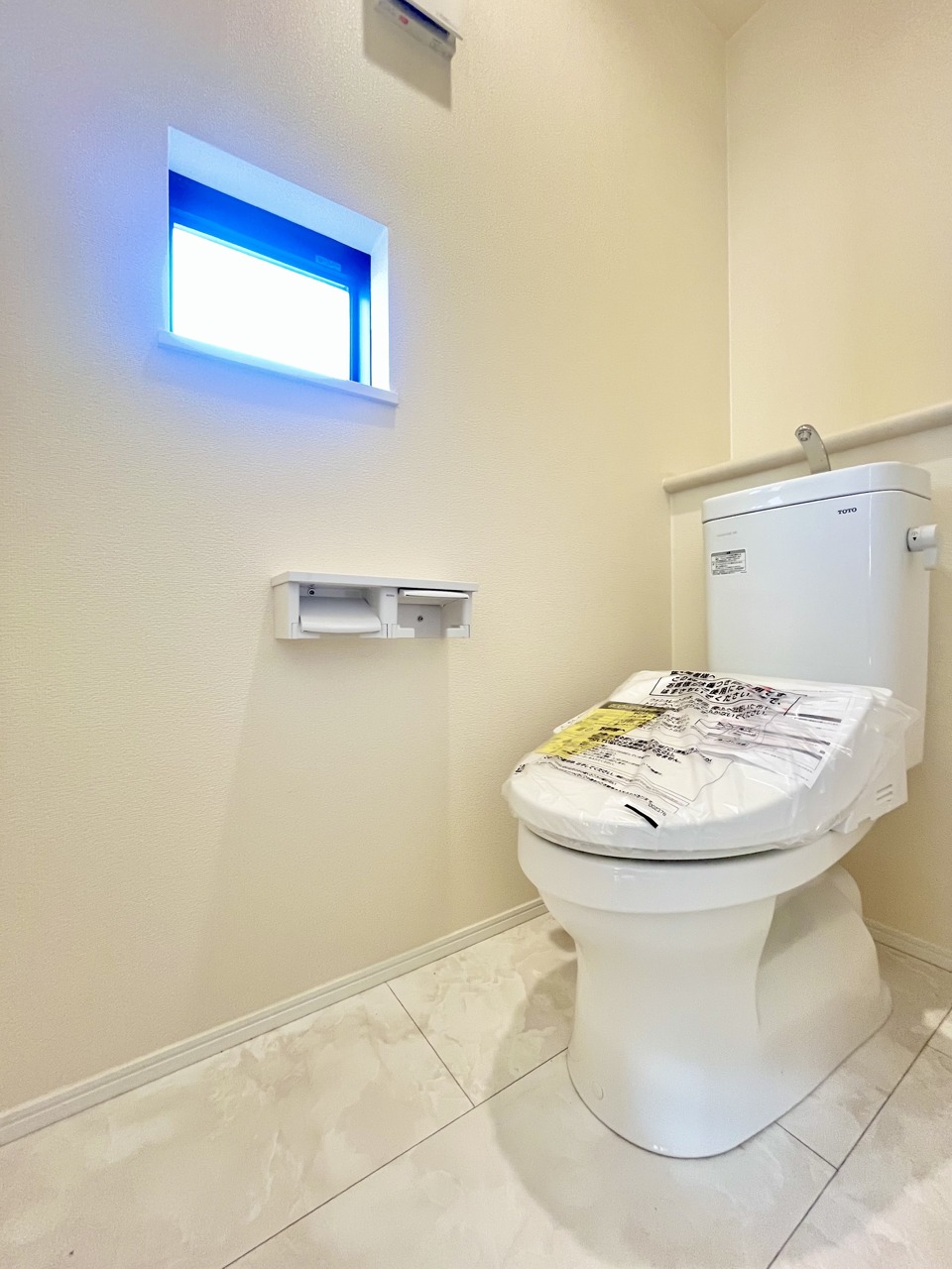 ウォシュレット機能付きのトイレ。換気のしやすい窓付きで、収納もあり実用性も兼ね備えた造り。