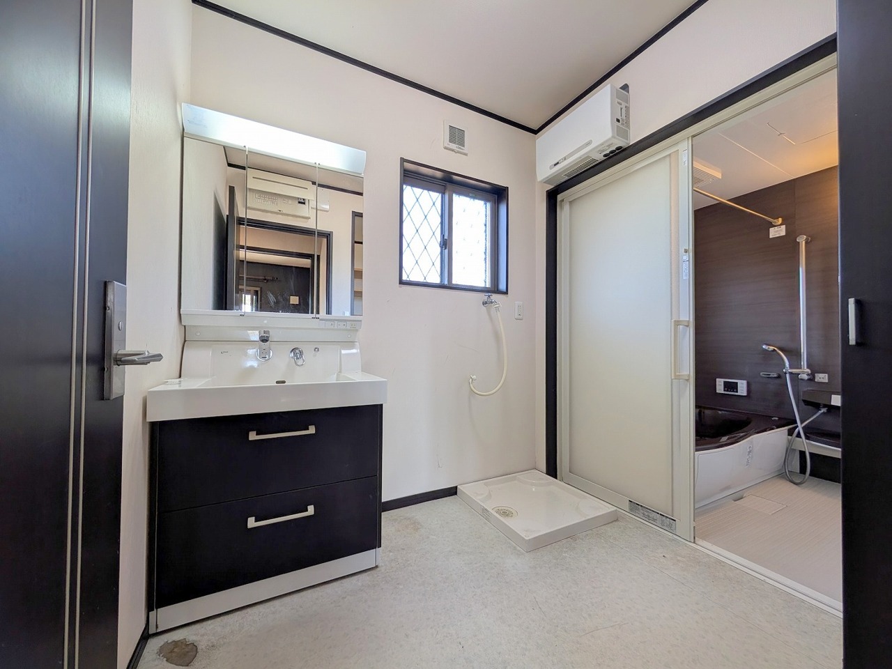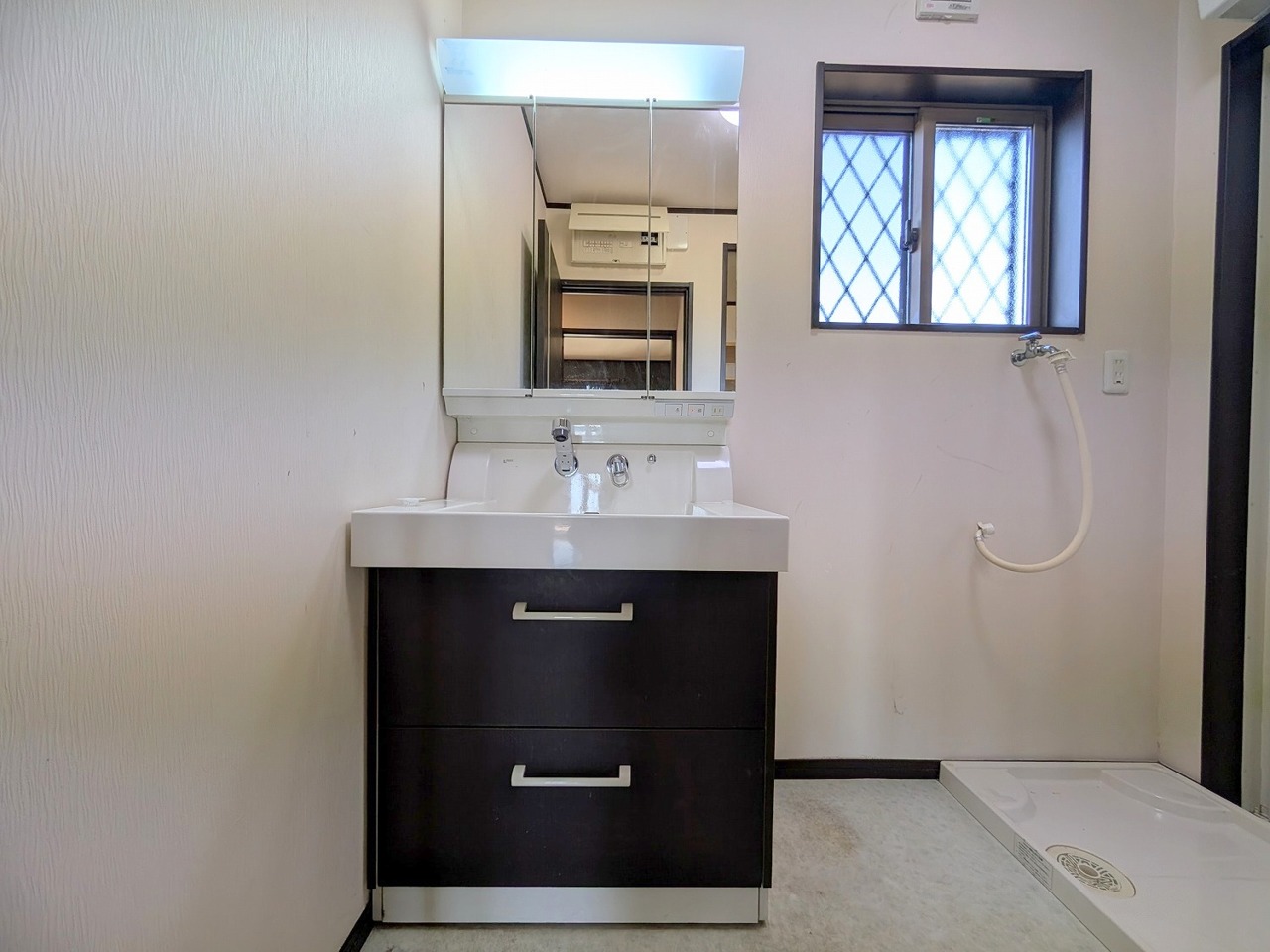 三面鏡を採用した洗面化粧台。鏡の裏にも収納スペースがあります。
