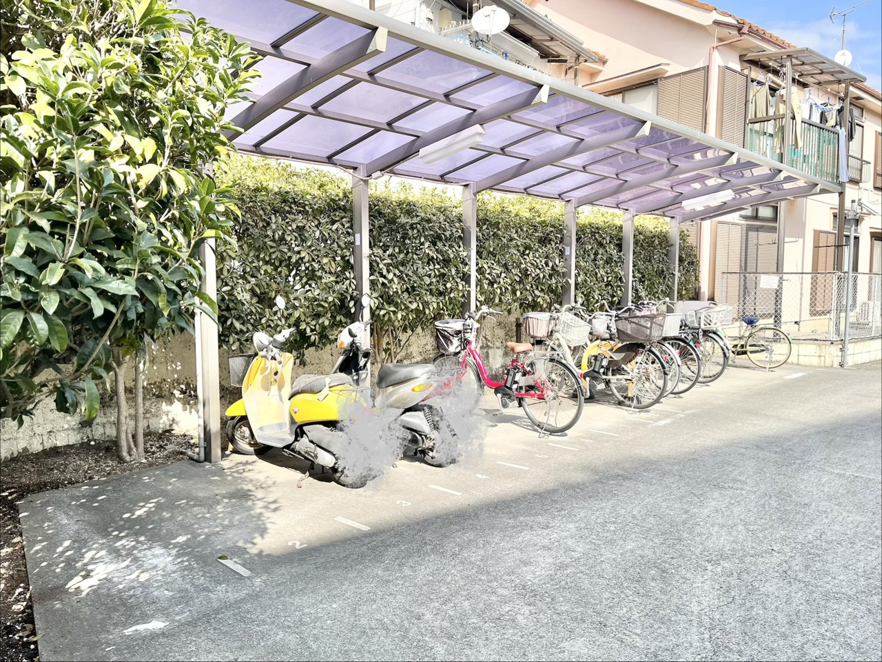 緑豊かな植栽と、雨風をしのぐ屋根のある駐輪スペース