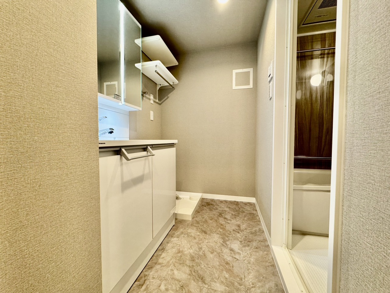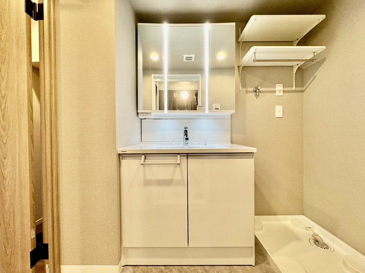 収納豊富な三面鏡付洗面化粧台。水回りのあれこれがキレイに収まりそうですね。