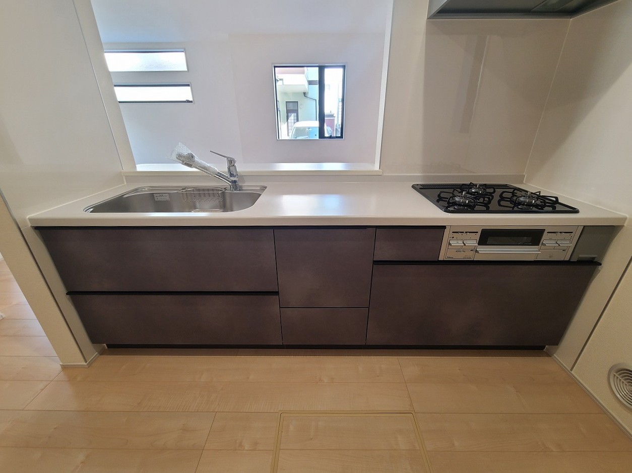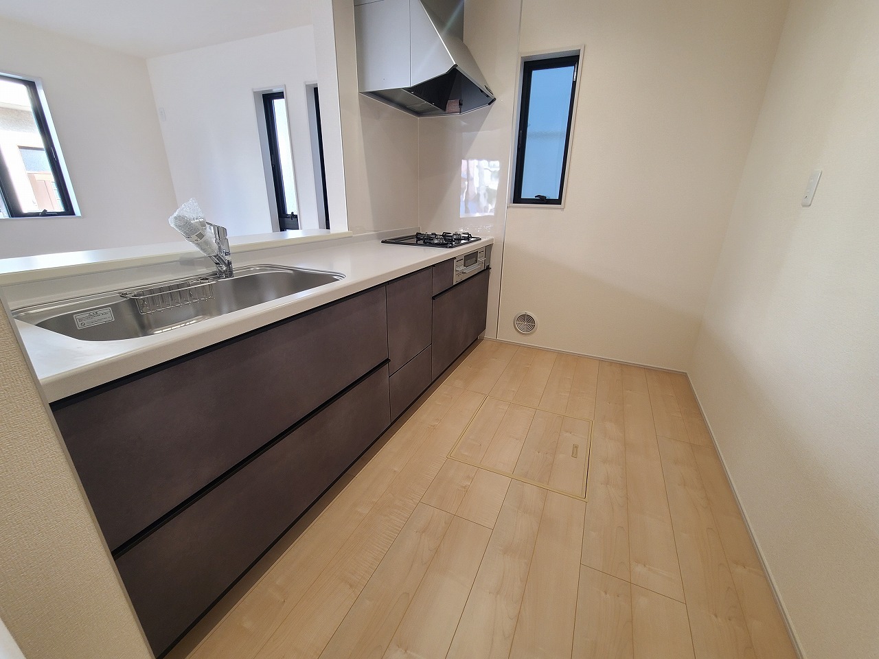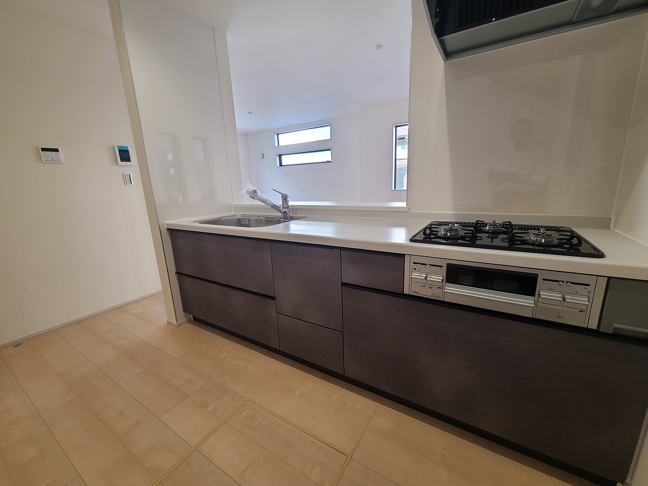 リビングにいる家族の顔が見渡せるカウンターキッチン。お料理もより一層おいしく、楽しく。食器棚を背面に設置しても十分な広さを確保しています。