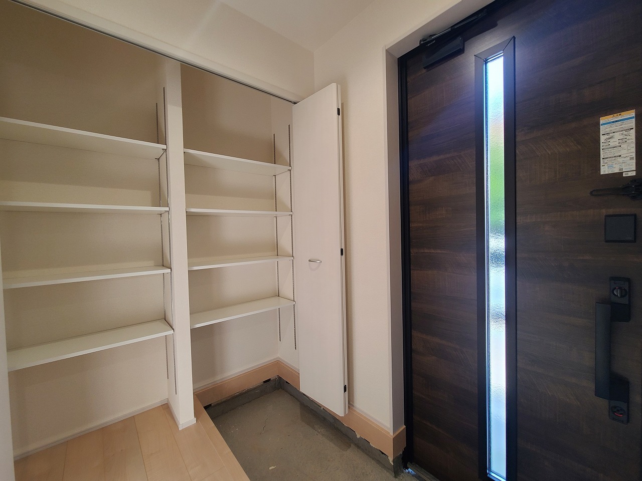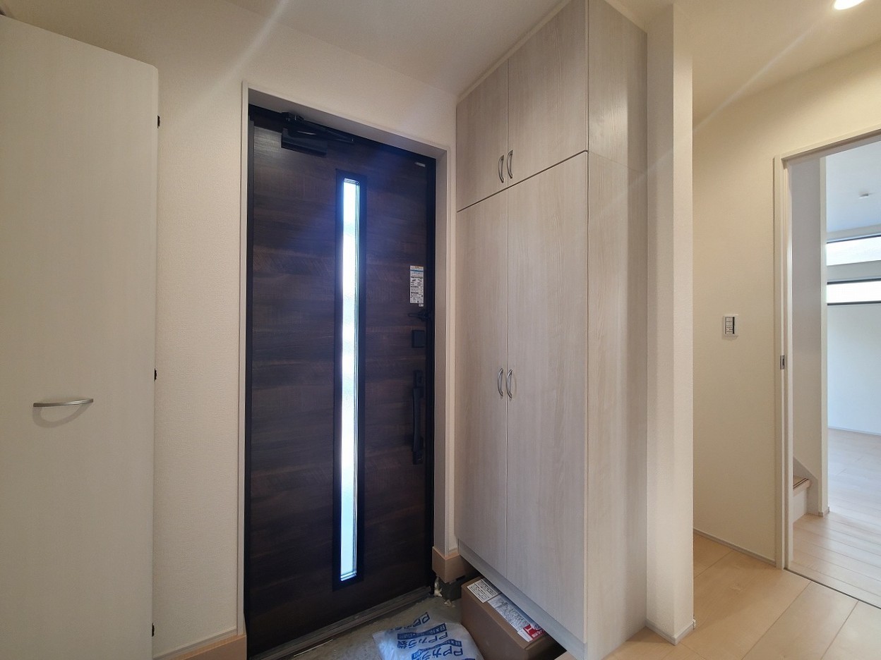 明るく開放的な玄関、靴の脱ぎ履きもしやすく、収納も豊富でご家族皆様の靴をスッキリ収納できます。