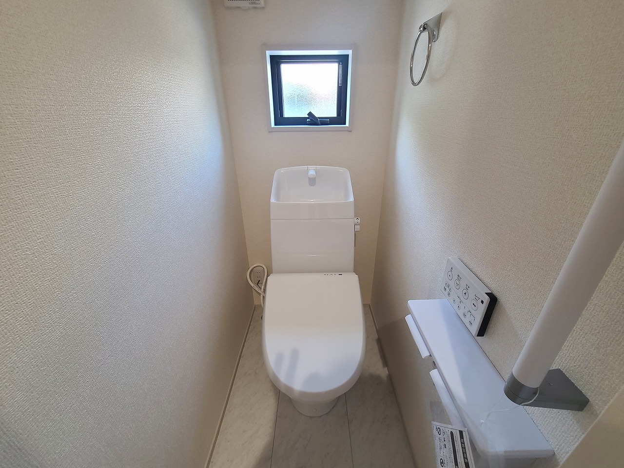 ウォシュレット機能付きのトイレ。換気のしやすい窓付きで、収納もあり実用性も兼ね備えた造り。