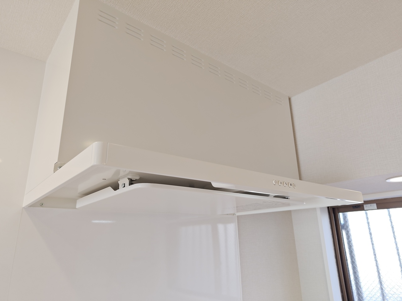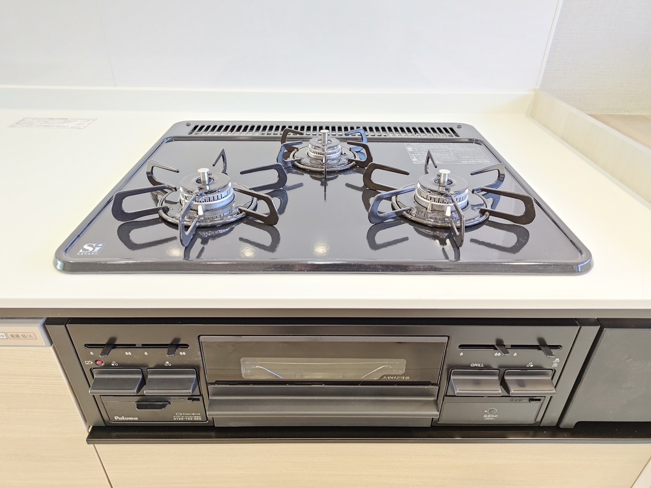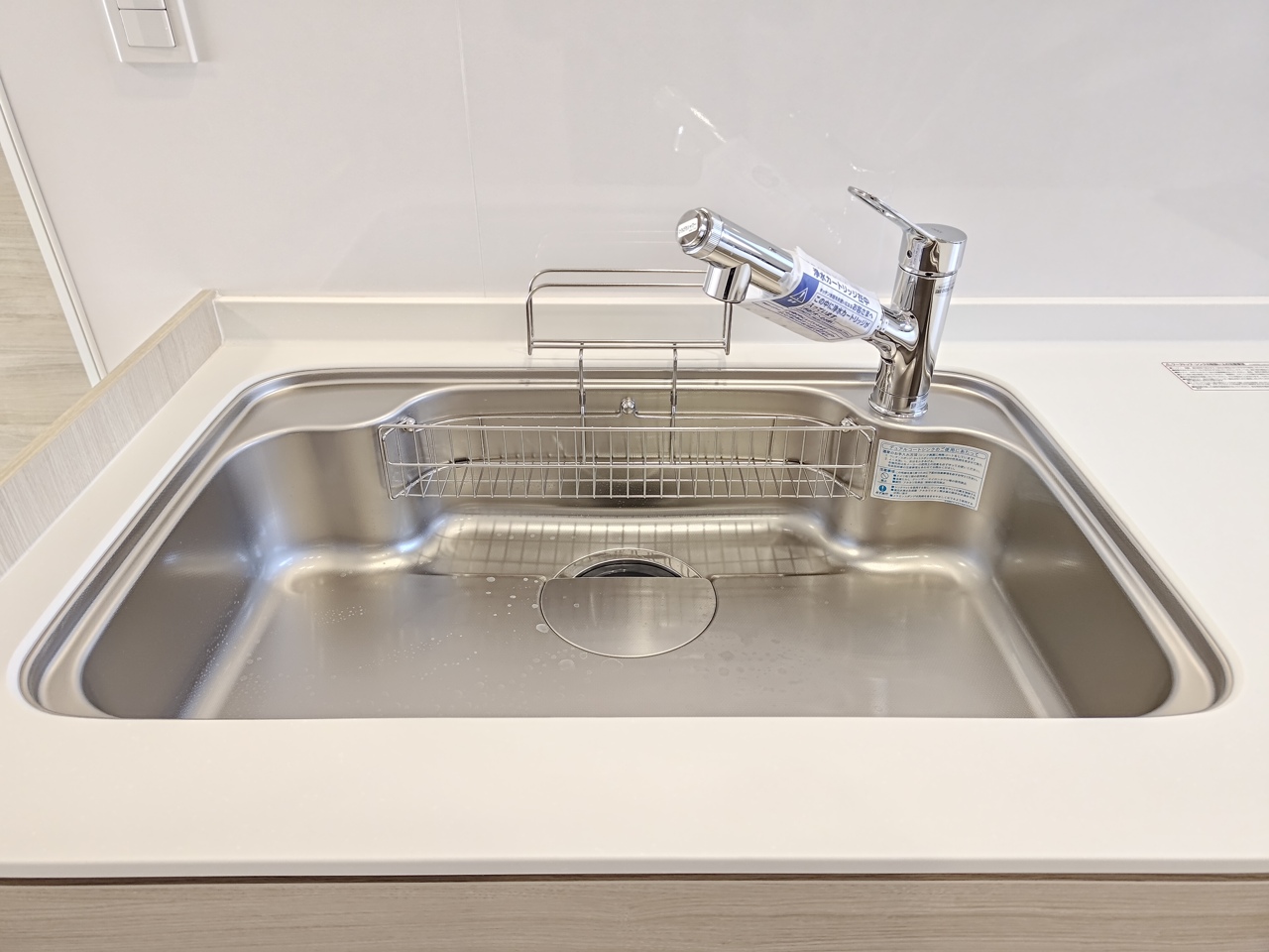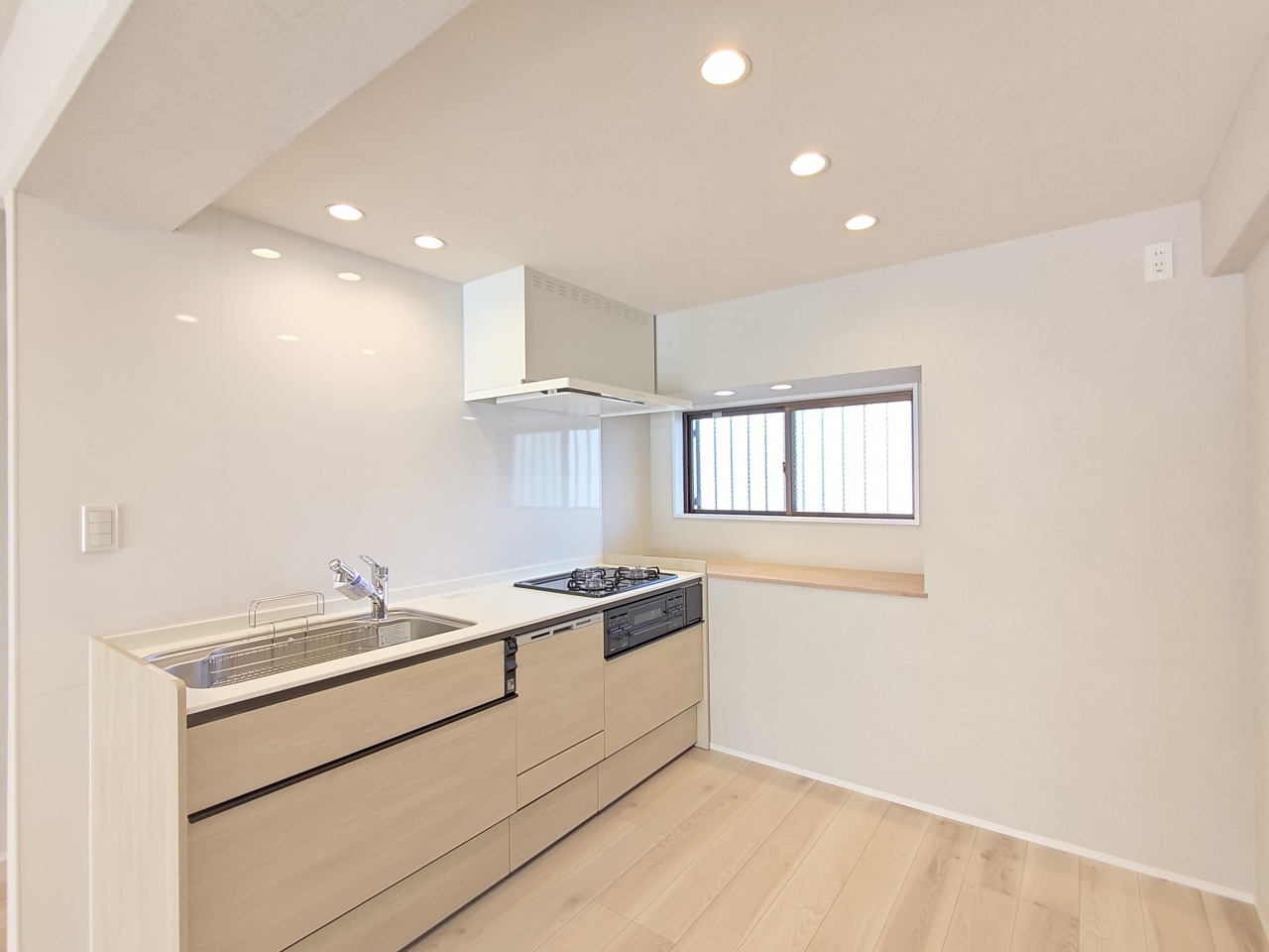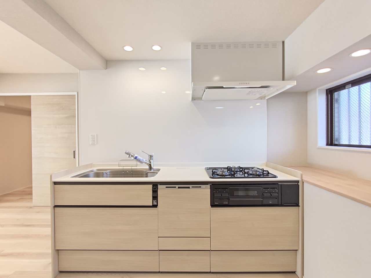 壁付けの新品システムキッチン。便利なビルトイン食洗器付きです。