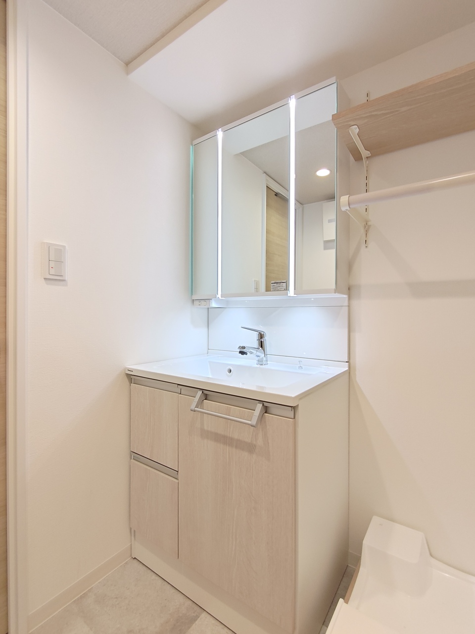 収納付きの洗面化粧台。鏡の裏側も収納棚になっています。
