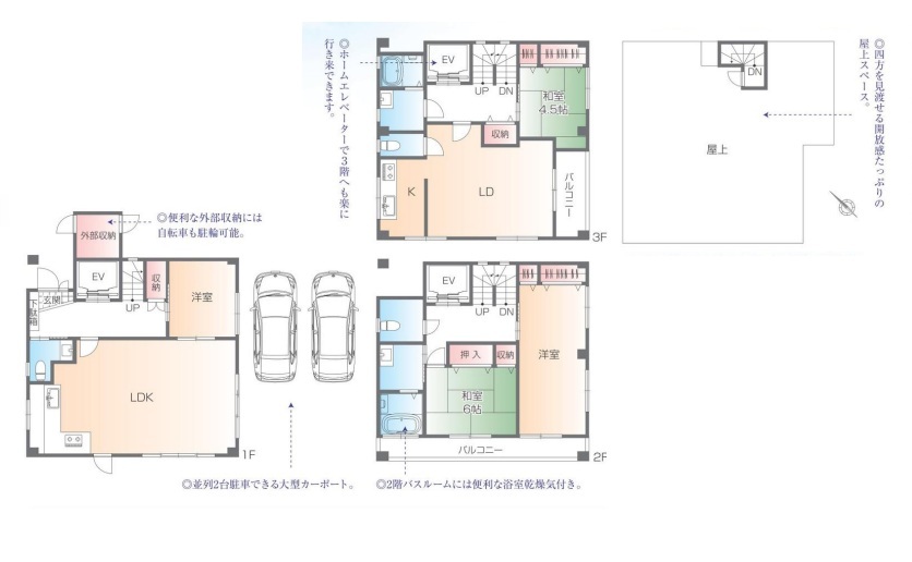 - ※完成予想図はいずれも外構、植栽、外観等実際のものとは多少異なることがあります。