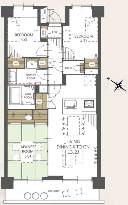 | 間取 | 3LDK (LDK13.2帖、洋室4.7帖、洋室4.3帖、和室6.0帖) | ||