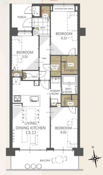 | 間取 | 3LDK (LDK13.1帖、洋室6.3帖、洋室6.0帖、洋室5.0帖) | ||