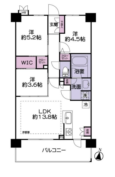 | 間取 | 3LDK (LDK13.8帖、洋室5.2帖、洋室4.5帖、洋室3.6帖) | ||