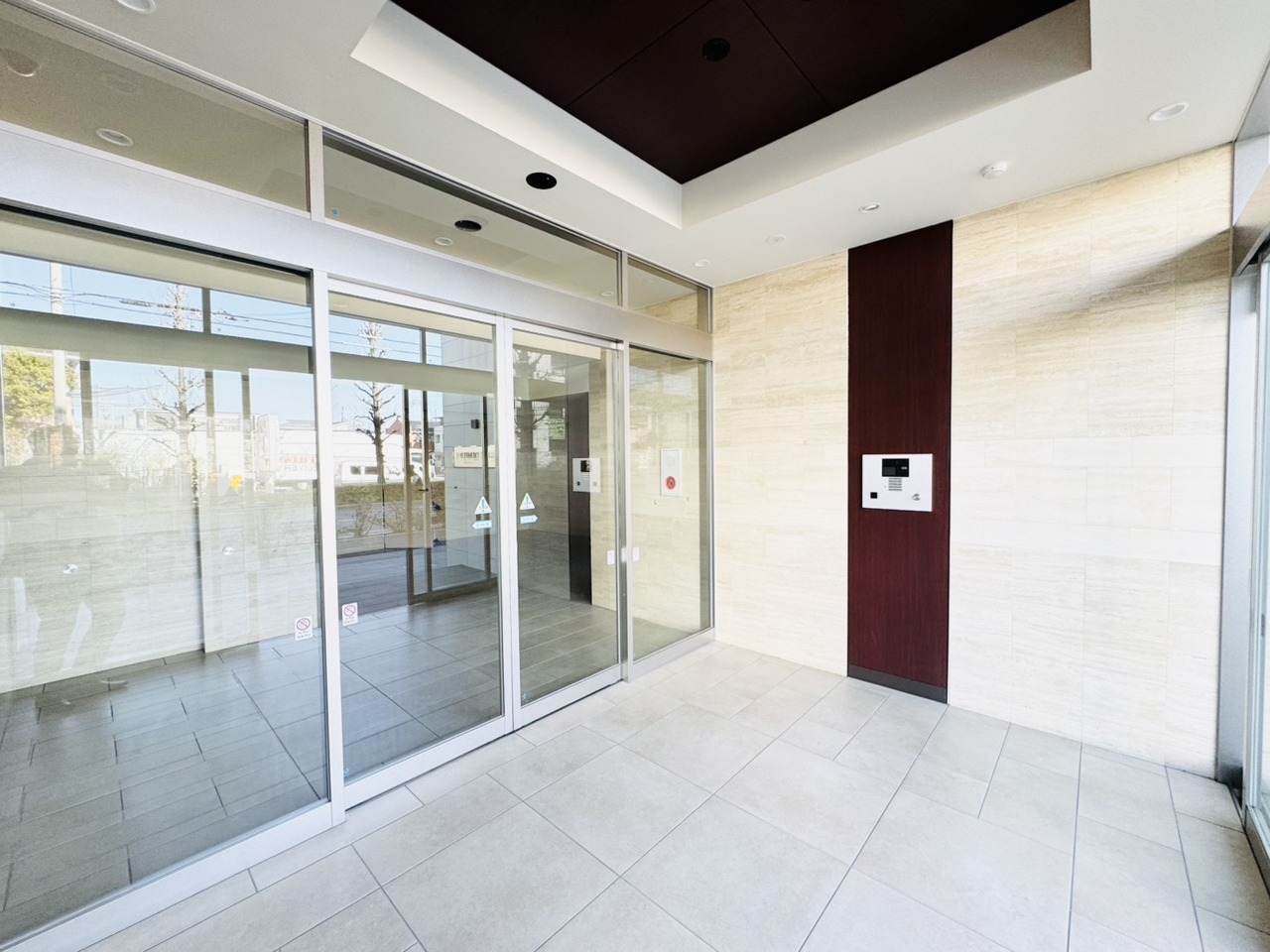 落ち着いた雰囲気のエントランス。オートロック式で防犯面にも配慮がなされ、宅配ボックスも備わっています。