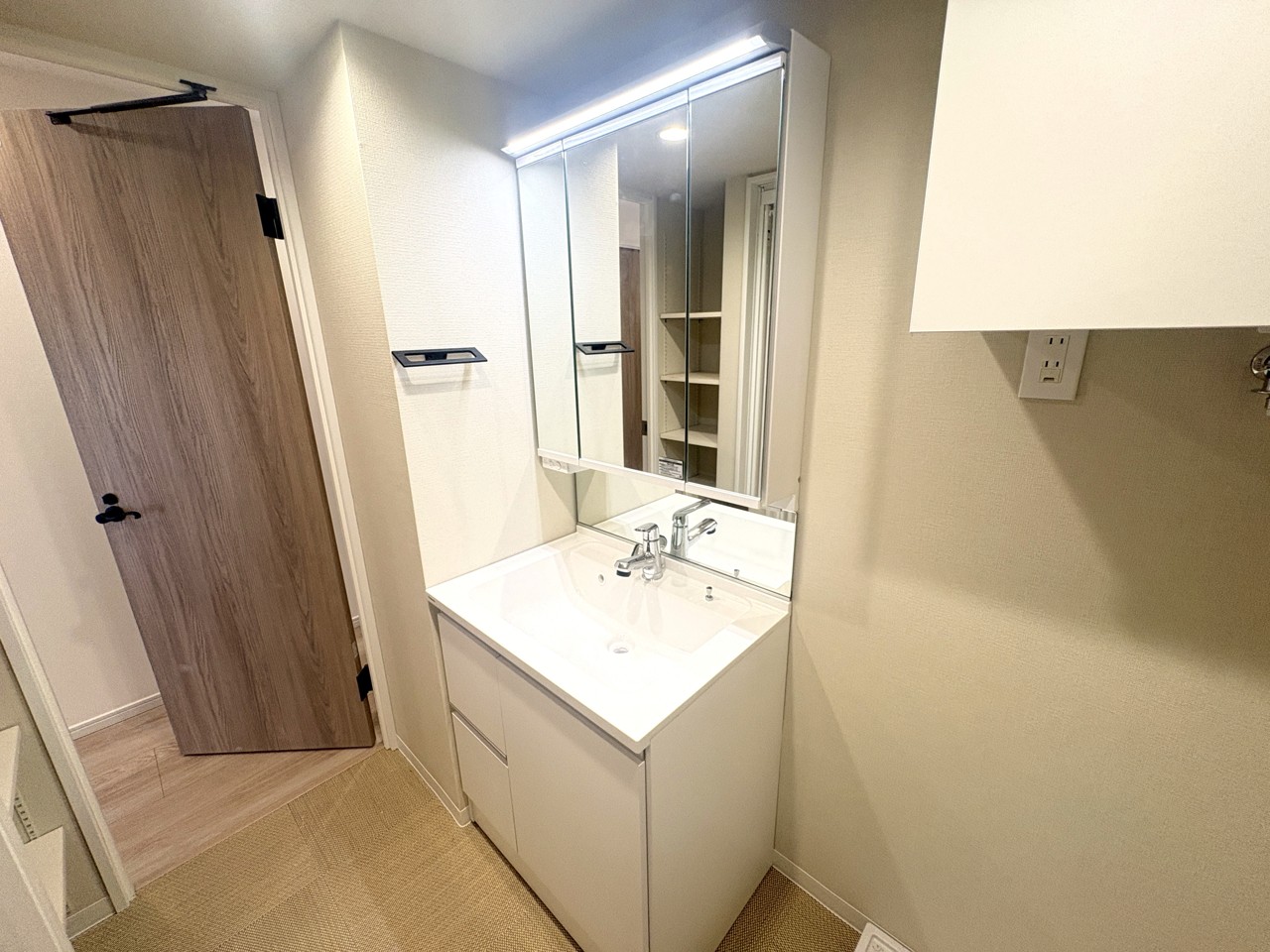 洗面化粧台は清潔感の漂うホワイトをベースカラーに、シンプルなデザインで。