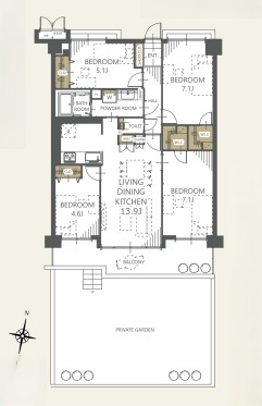 | 間取 | 4LDK (LDK13.9帖、洋室7.1帖、洋室7.1帖、洋室5.1帖、洋室4.6帖) | ||
