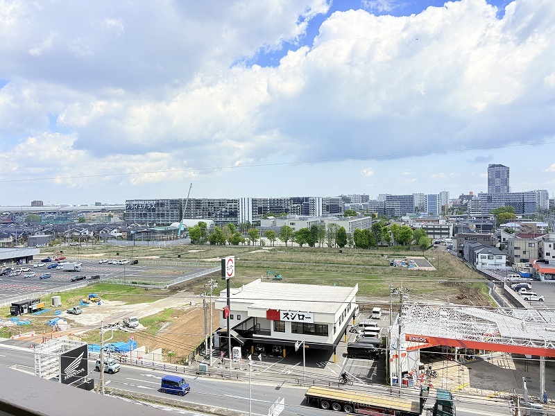 広々とした空と、整然と並ぶ車が印象的な、落ち着きのある景観。