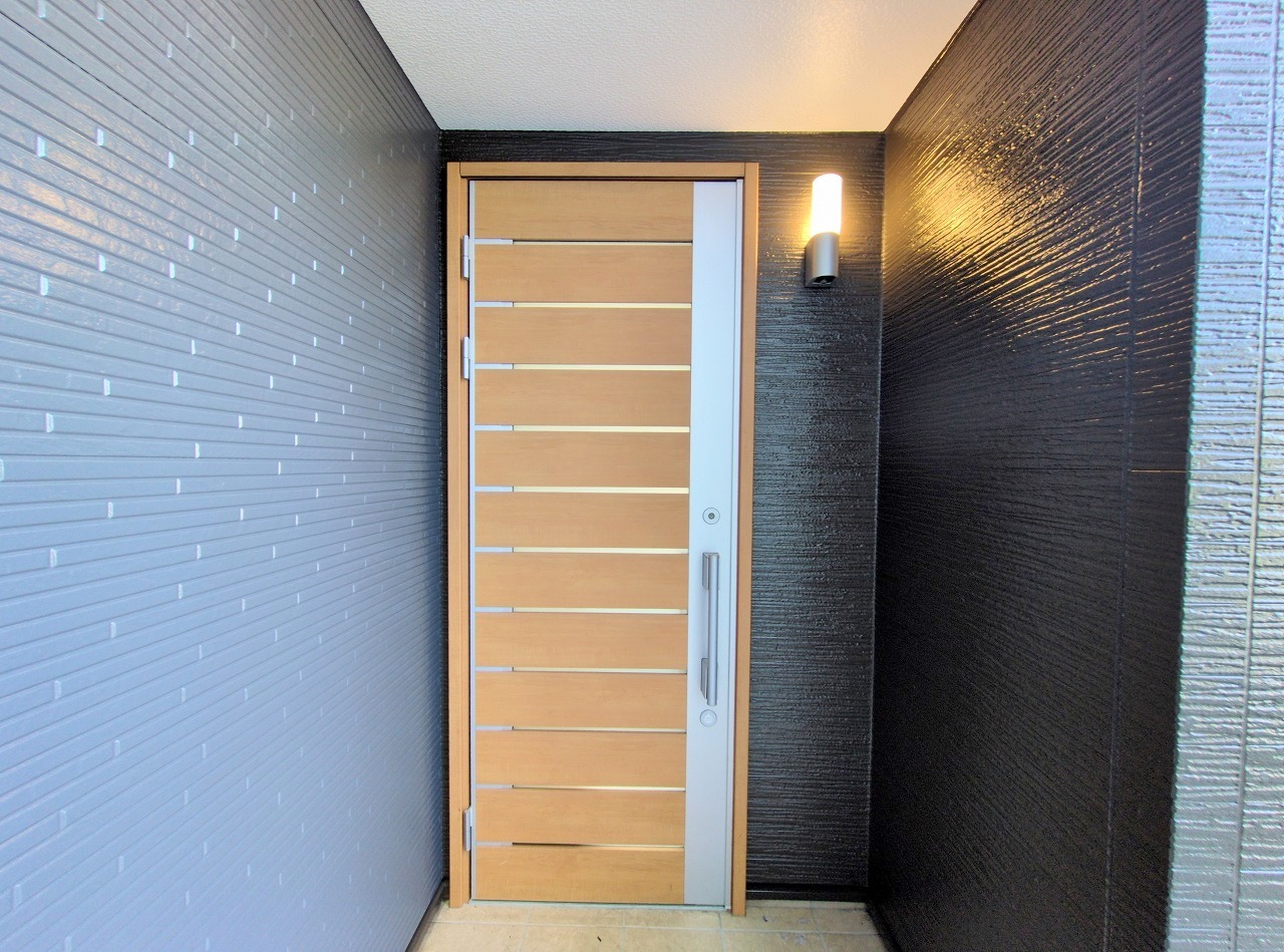 温かな木目と洗練された壁材が調和する、落ち着いた空間