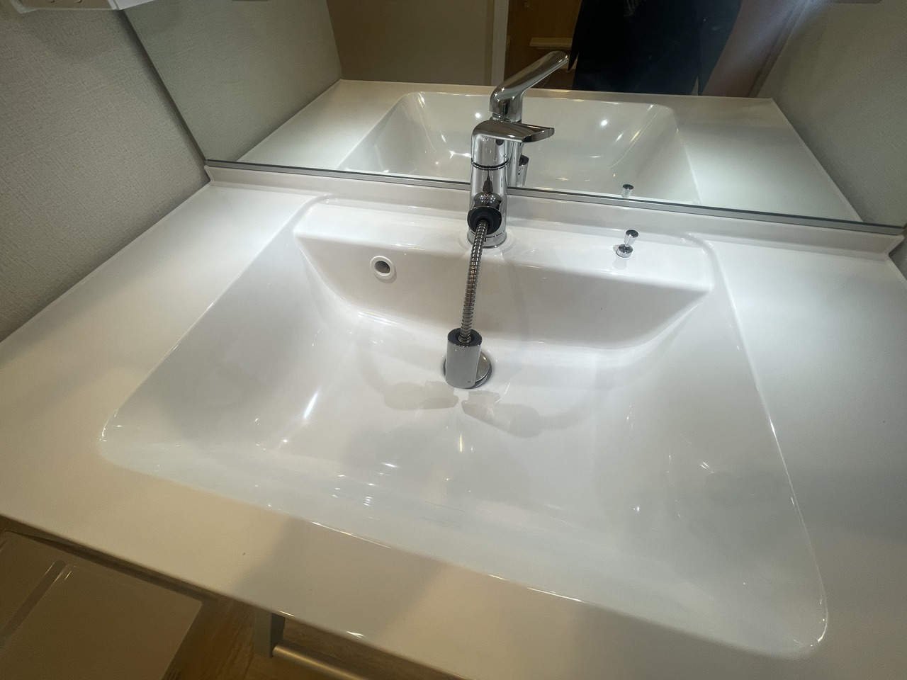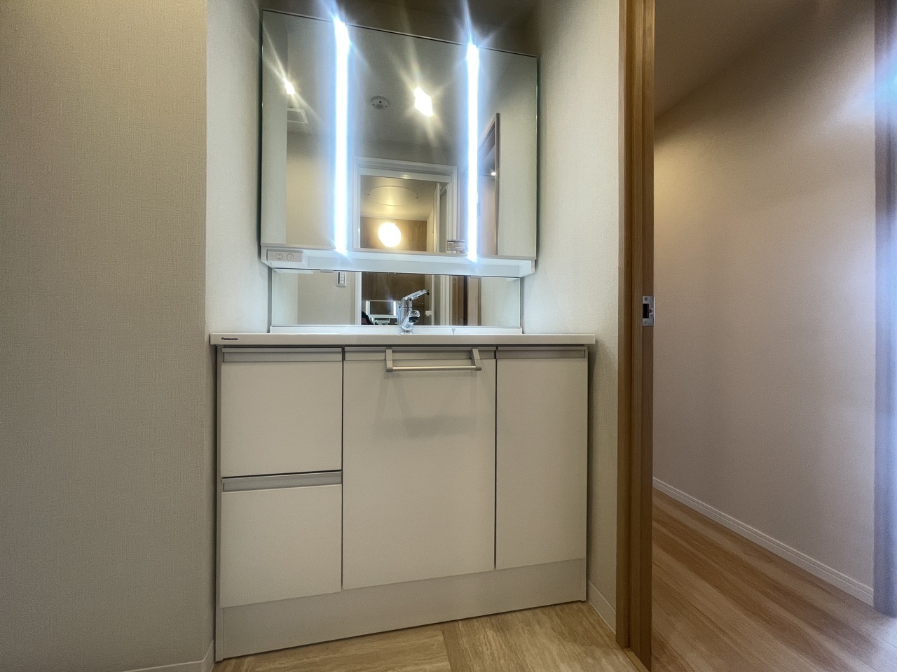 洗面化粧台は清潔感の漂うホワイトをベースカラーに、シンプルなデザインで。