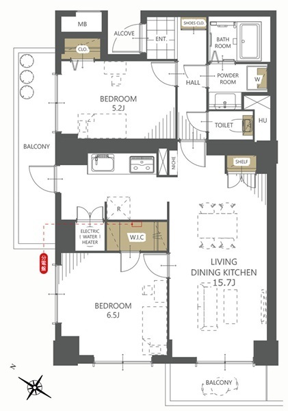 | 間取 | 2LDK + 洋6.5×1・洋5.2×1・LDK15.7×1 (LDK15.7帖) | ||