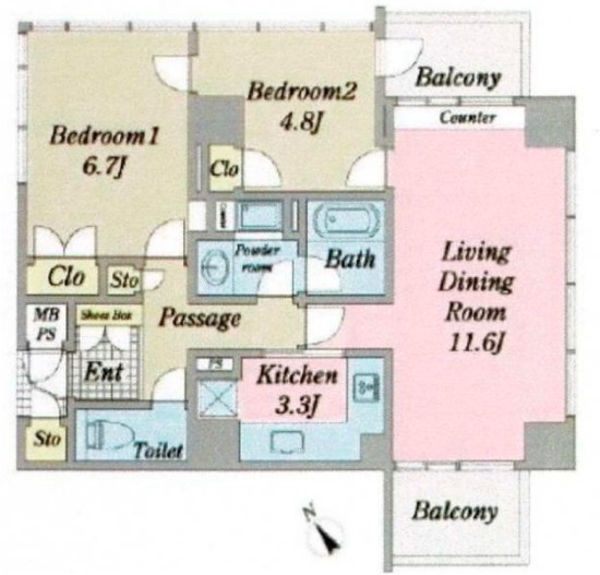 | 間取 | 2LDK (LD11.6帖、K3.3帖、洋室6.7帖、洋室4.8帖) | ||