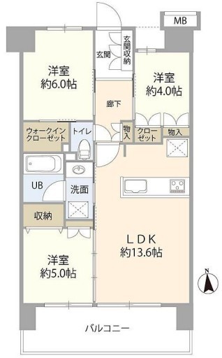 | 間取 | 3LDK (LDK13.6帖、洋室6.0帖、洋室5.0帖、洋室4.0帖) | ||