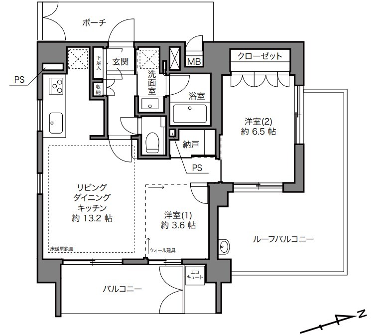 | 間取 | 2LDK (LDK13.2帖、洋室6.5帖、洋室3.6帖) | ||