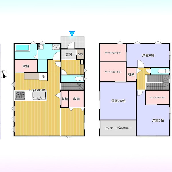 | 間取 | 3LDK (LDK20.5帖、洋室7.5帖、洋室6帖、洋室6帖) | ||