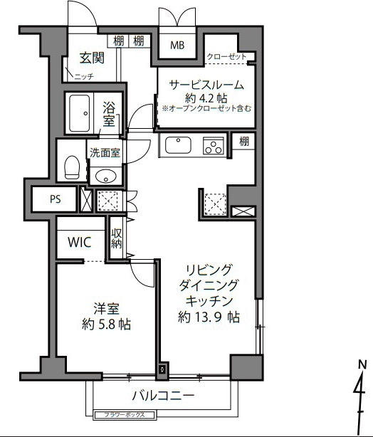 | 間取 | 1SLDK (LDK13.9帖、洋室5.8帖、S4.2帖) | ||