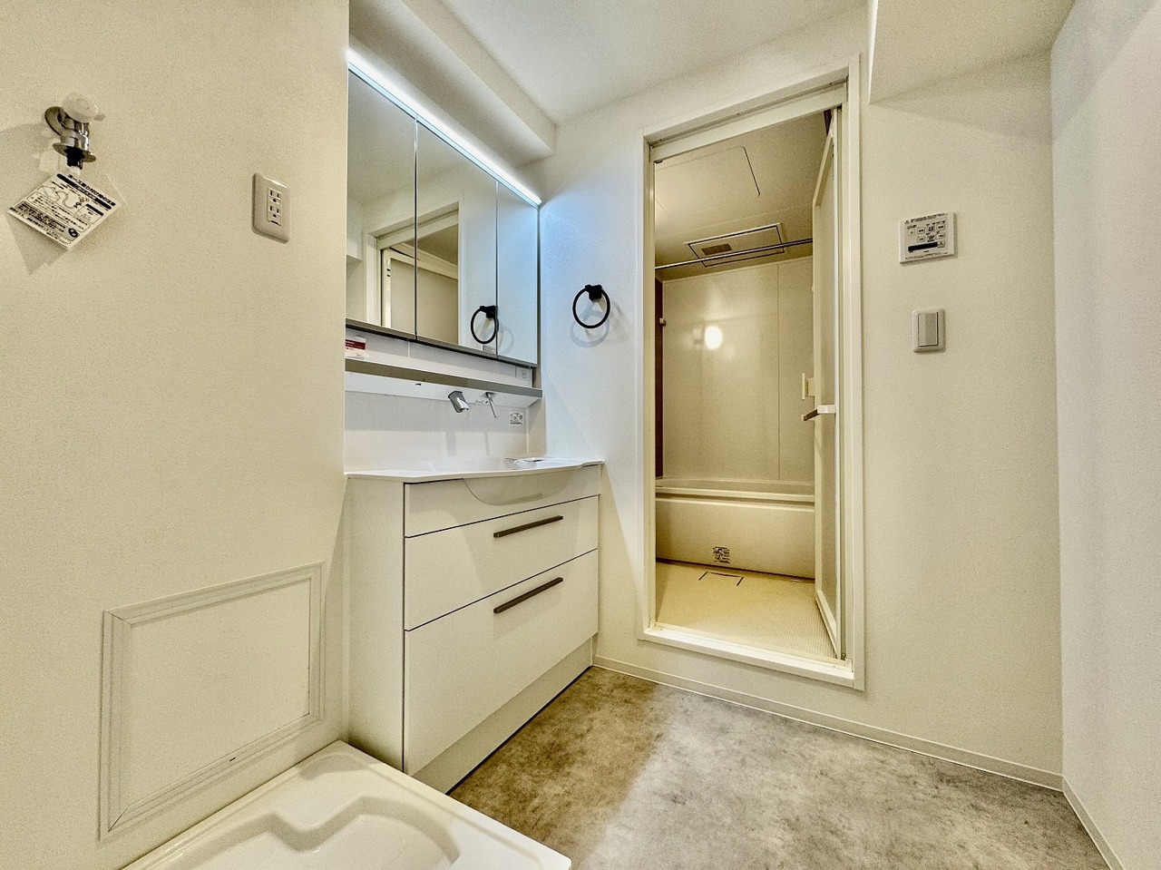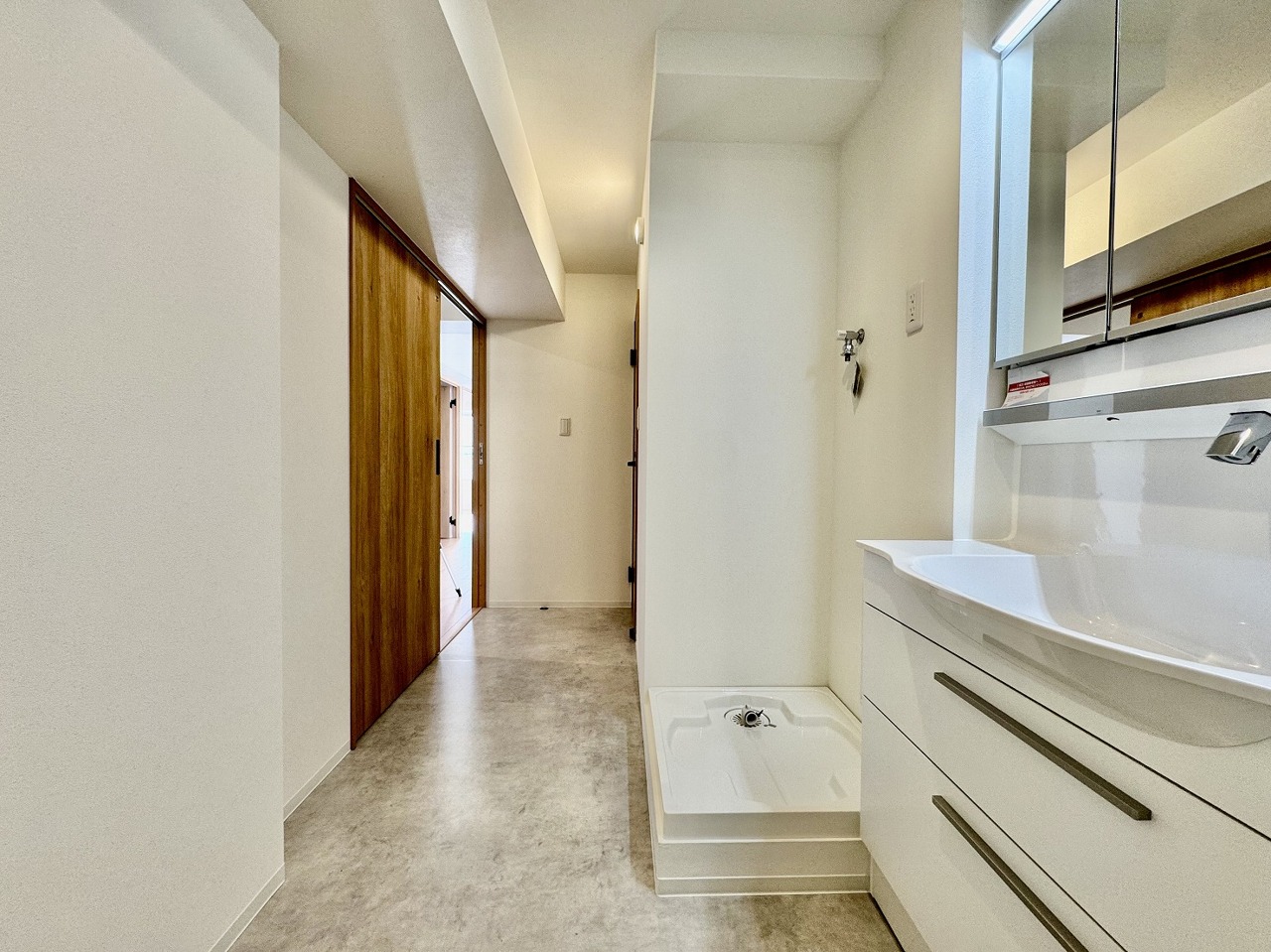 収納豊富な三面鏡付洗面化粧台。水回りのあれこれがキレイに収まりそうですね。